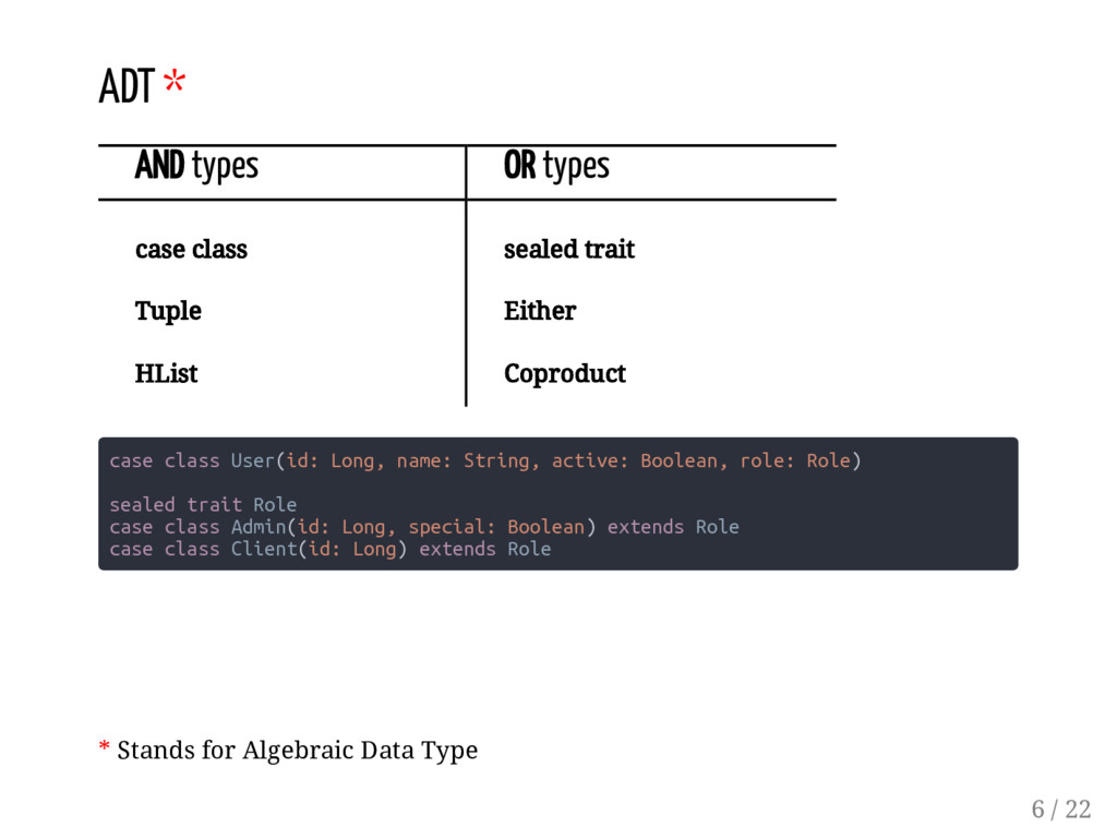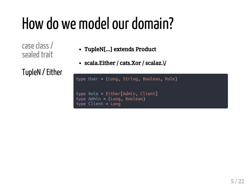 Product scala.Either / cats.Xor / scalaz.\/ type User = (Long, String, Boolean, Role) type Role = Either[Admin, Client] type Admin = (Long, Boolean) type Client = Long How do we model our domain? 5 / 22