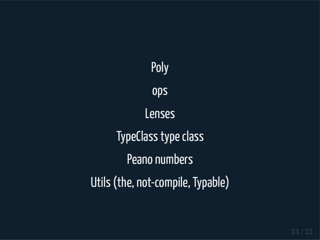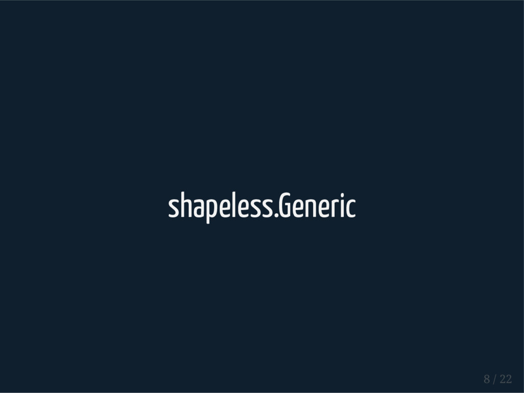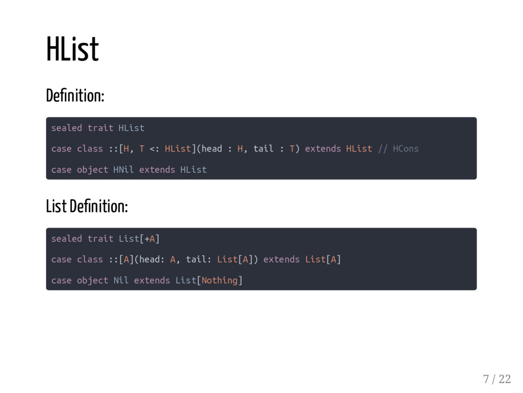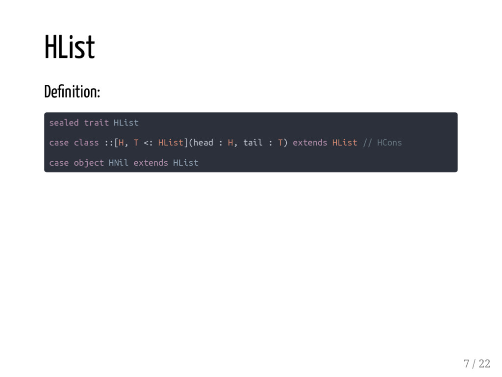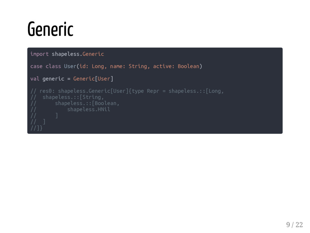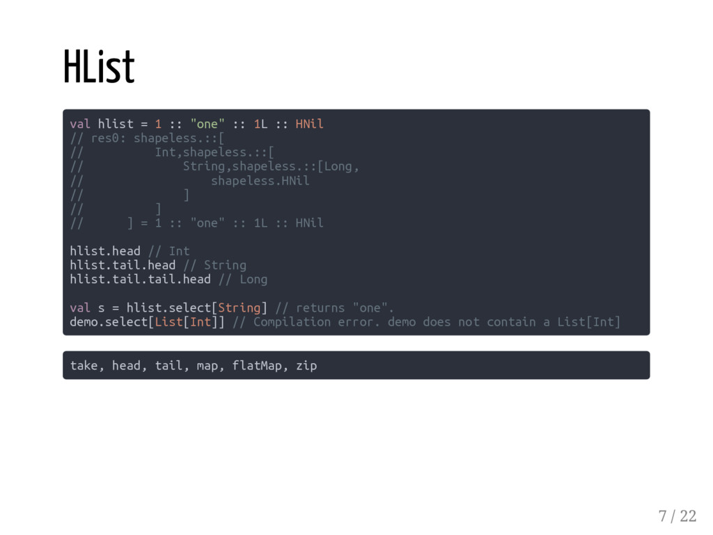 Coproduct HList Coproduct type User = Long :: String :: Boolean :: Role :: HNil type Role = Admin :+: Client :+: CNil type Admin = Long :: Boolean :: HNil type Client = Long :: HNil Abstracting over arity val admin: Role = Inl(2L :: true :: HNil) val sandy: User = 1 :: "Sandy" :: true :: admin :: HNil // res5: User = 1 :: Sandy :: true :: Inl(2 :: true :: HNil) 5 / 22