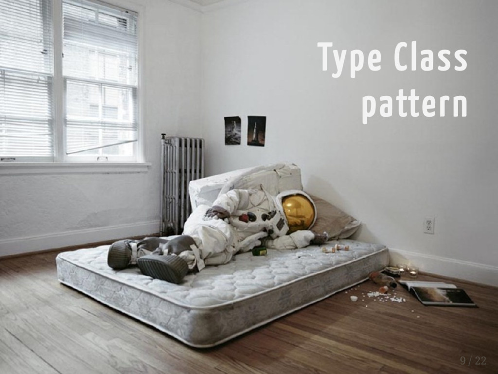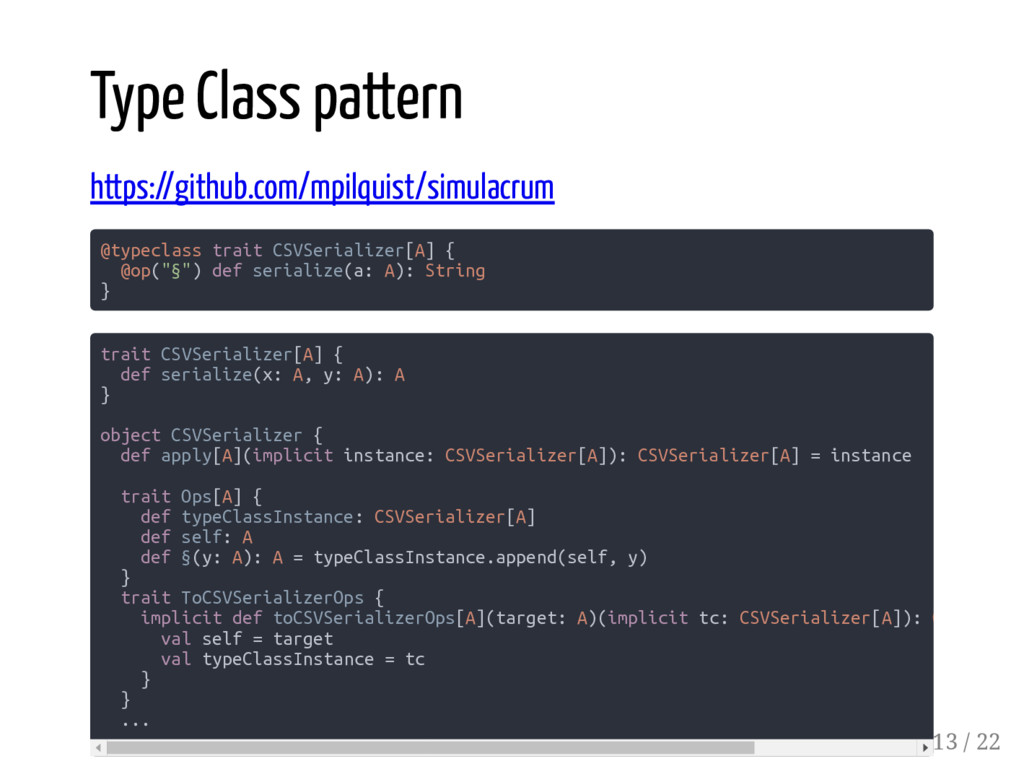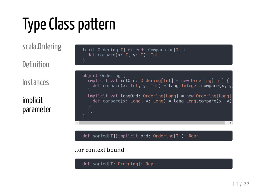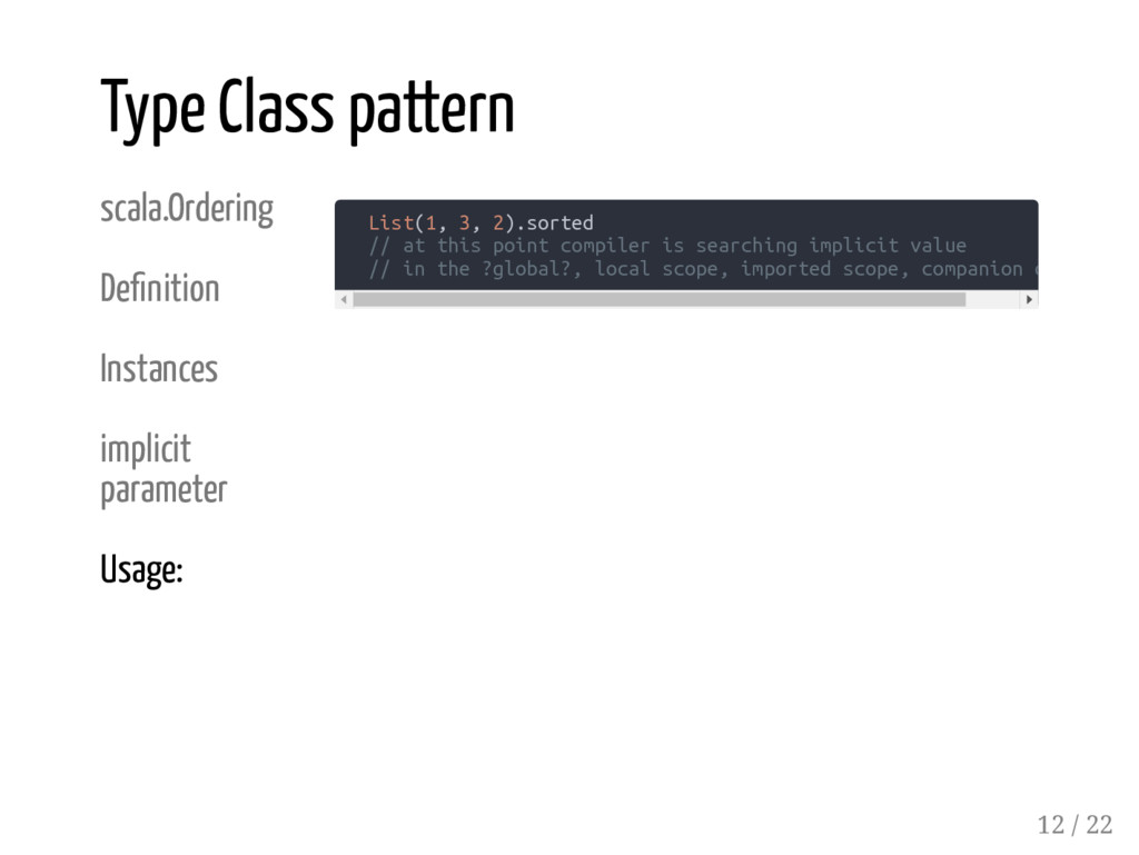 represent * a strategy for sorting instances of a type. * ... */ trait Ordering[T] extends Comparator[T] { /** * Returns an integer whose sign communicates * how x compares to y. */ def compare(x: T, y: T): Int } Type Class pattern 11 / 22