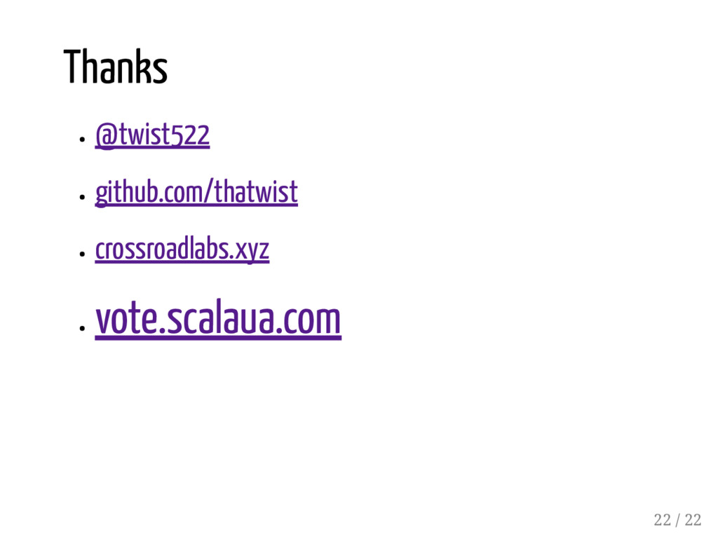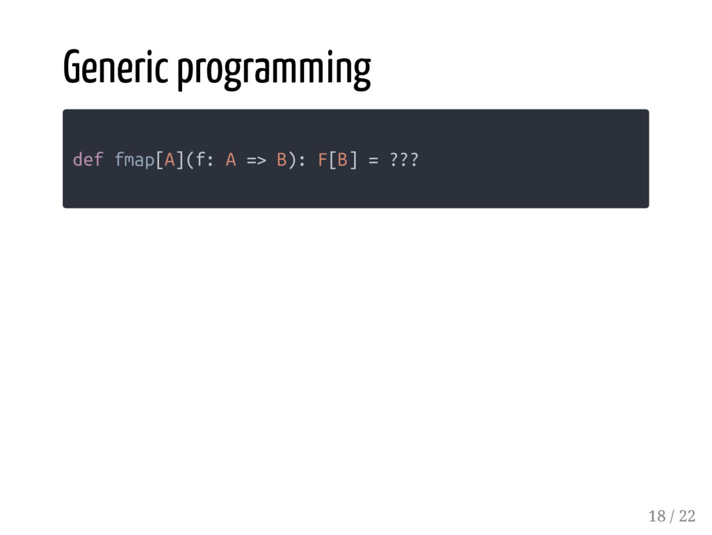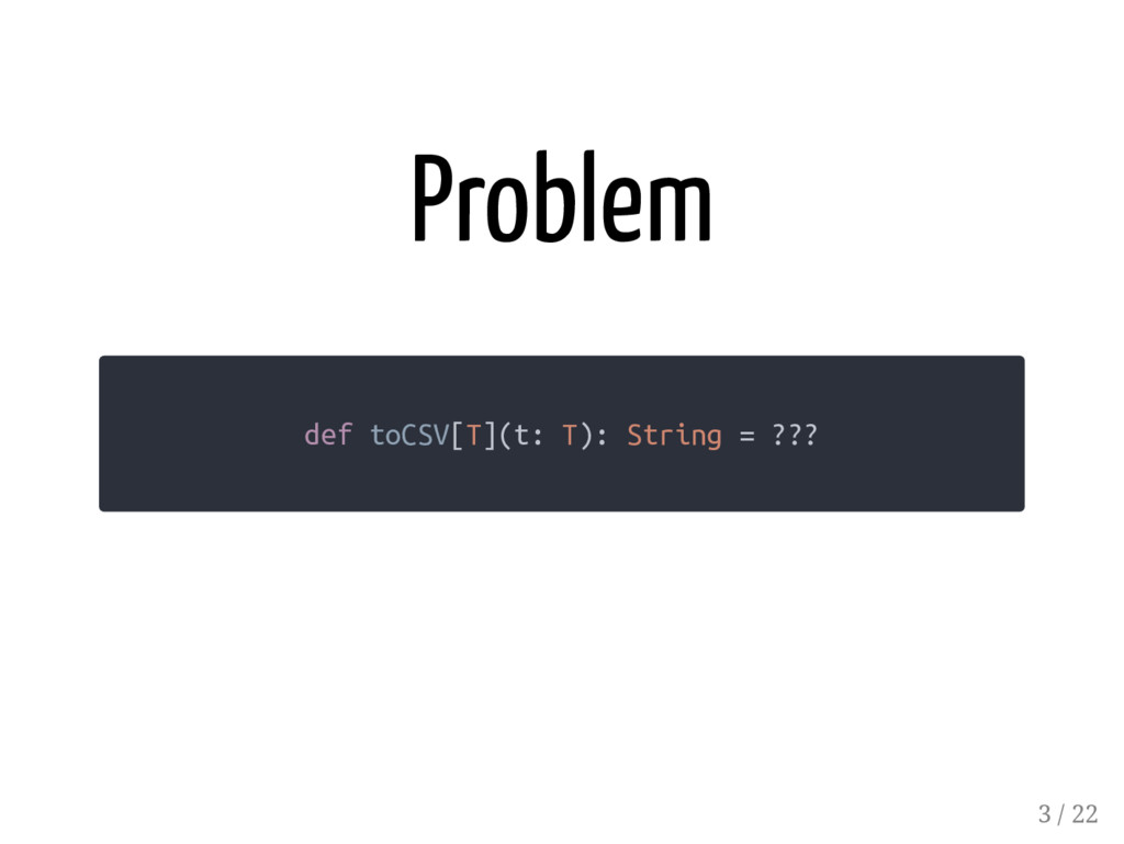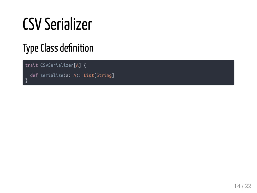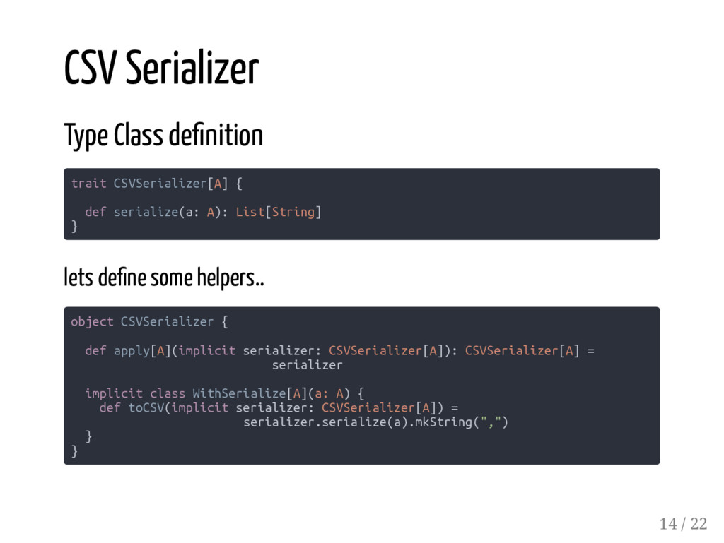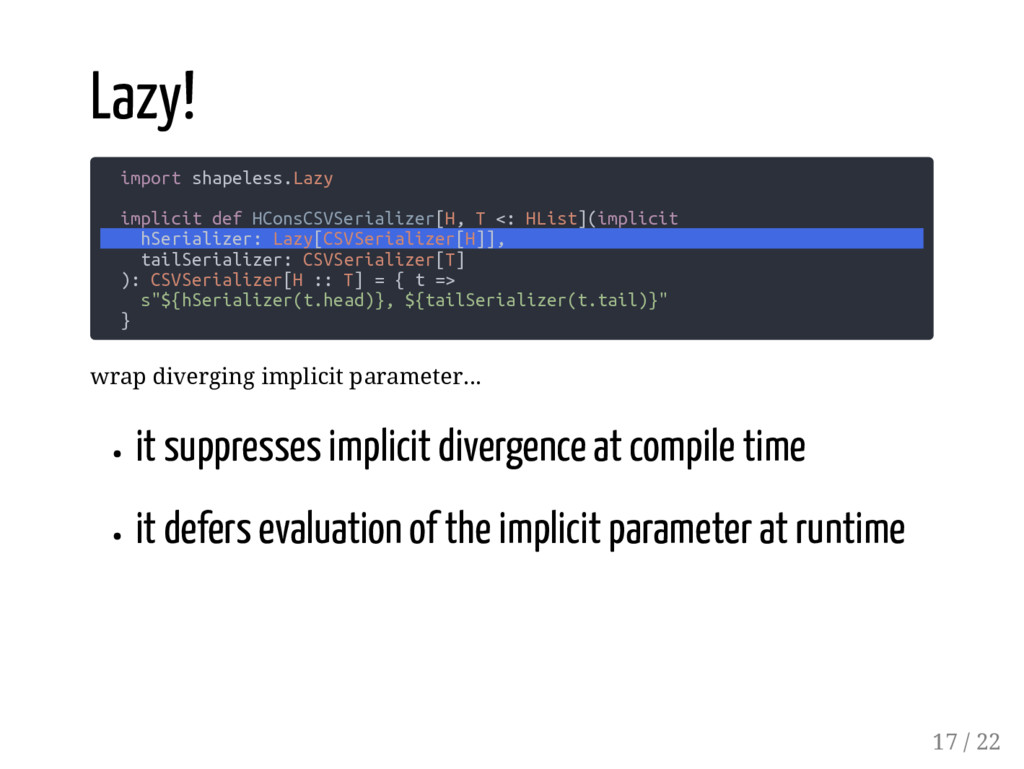 Lazy[CSVSerializer[H]], tailSerializer: CSVSerializer[T] ): CSVSerializer[H :: T] = { t => s"${hSerializer(t.head)}, ${tailSerializer(t.tail)}" } wrap diverging implicit parameter... it suppresses implicit divergence at compile time it defers evaluation of the implicit parameter at runtime 17 / 22