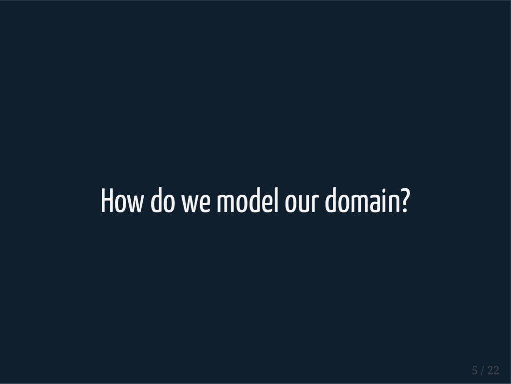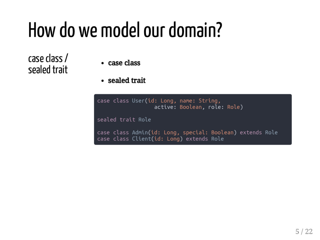 class User(id: Long, name: String, active: Boolean, role: Role) sealed trait Role case class Admin(id: Long, special: Boolean) extends Role case class Client(id: Long) extends Role How do we model our domain? 5 / 22