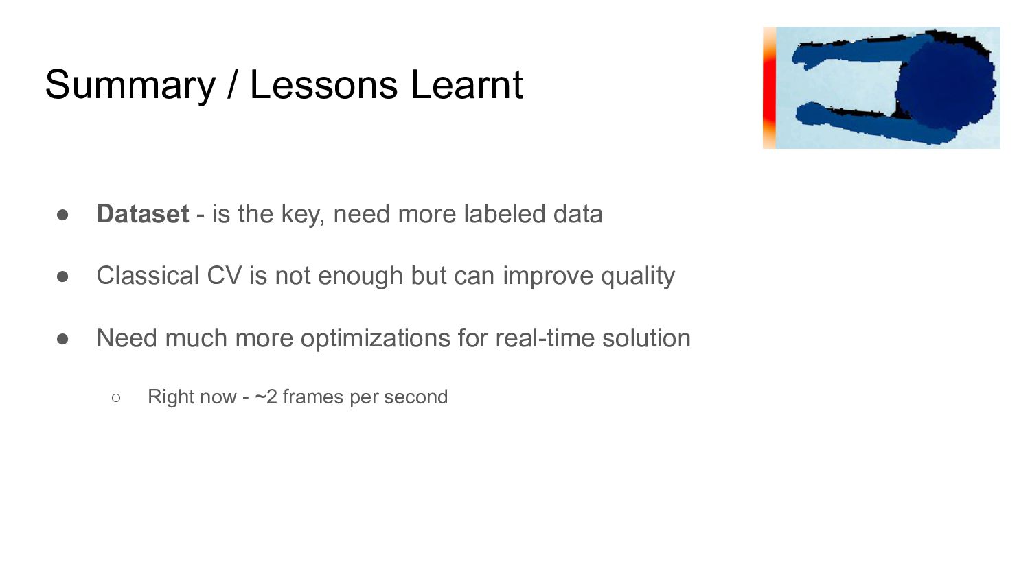 need more labeled data • Classical CV is not enough but can improve quality • Need much more optimizations for real-time solution ◦ Right now - ~2 frames per second
