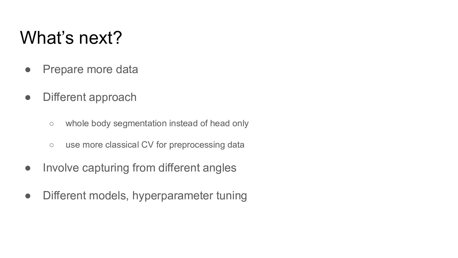 whole body segmentation instead of head only ◦ use more classical CV for preprocessing data • Involve capturing from different angles • Different models, hyperparameter tuning