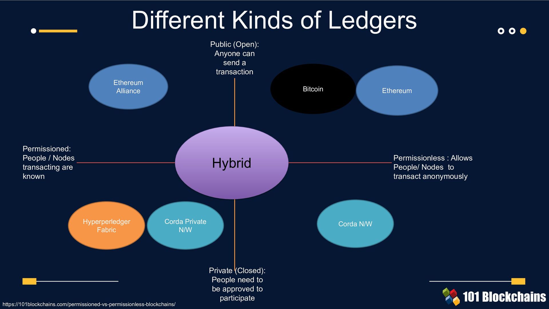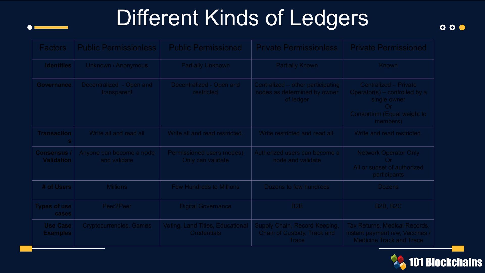 Permissionless Private Permissioned Identities Unknown / Anonymous Partially Unknown Partially Known Known Governance Decentralized - Open and transparent Decentralized - Open and restricted Centralized – other participating nodes as determined by owner of ledger Centralized – Private Operator(s) – controlled by a single owner Or Consortium (Equal weight to members) Transaction s Write all and read all Write all and read restricted. Write restricted and read all. Write and read restricted. Consensus / Validation Anyone can become a node and validate Permissioned users (nodes) Only can validate Authorized users can become a node and validate Network Operator Only Or All or subset of authorized participants # of Users Millions Few Hundreds to Millions Dozens to few hundreds Dozens Types of use cases Peer2Peer Digital Governance B2B B2B, B2C Use Case Examples Cryptocurrencies, Games Voting, Land Titles, Educational Credentials Supply Chain, Record Keeping, Chain of Custody, Track and Trace Tax Returns, Medical Records, instant payment n/w, Vaccines / Medicine Track and Trace