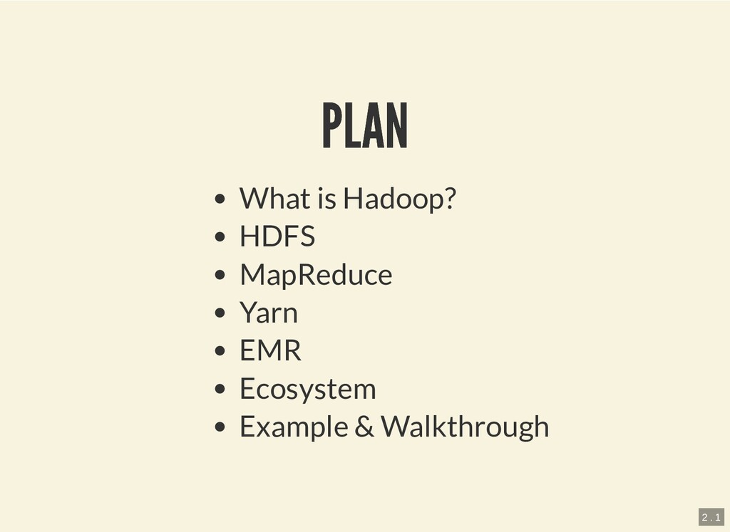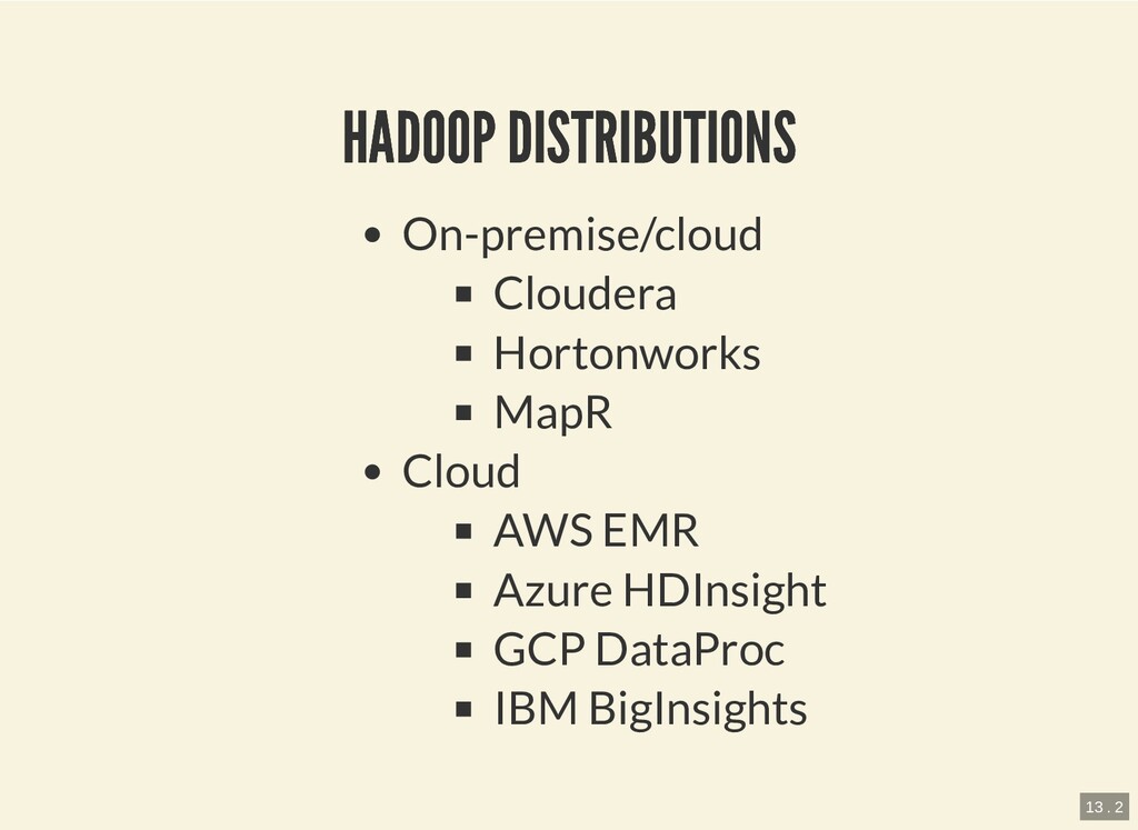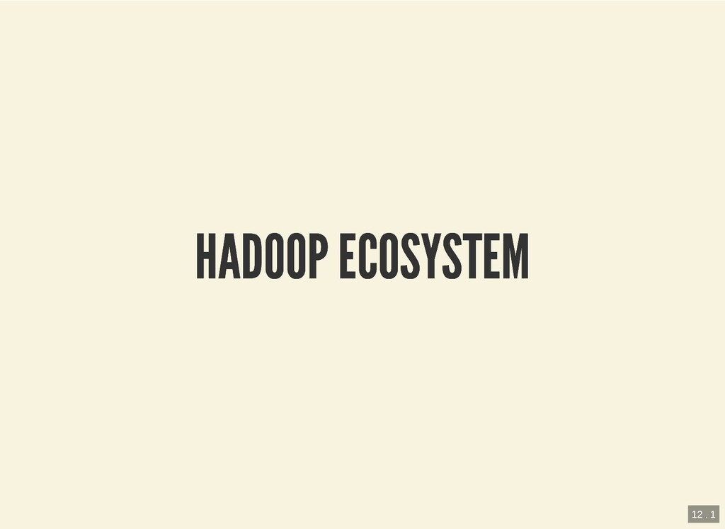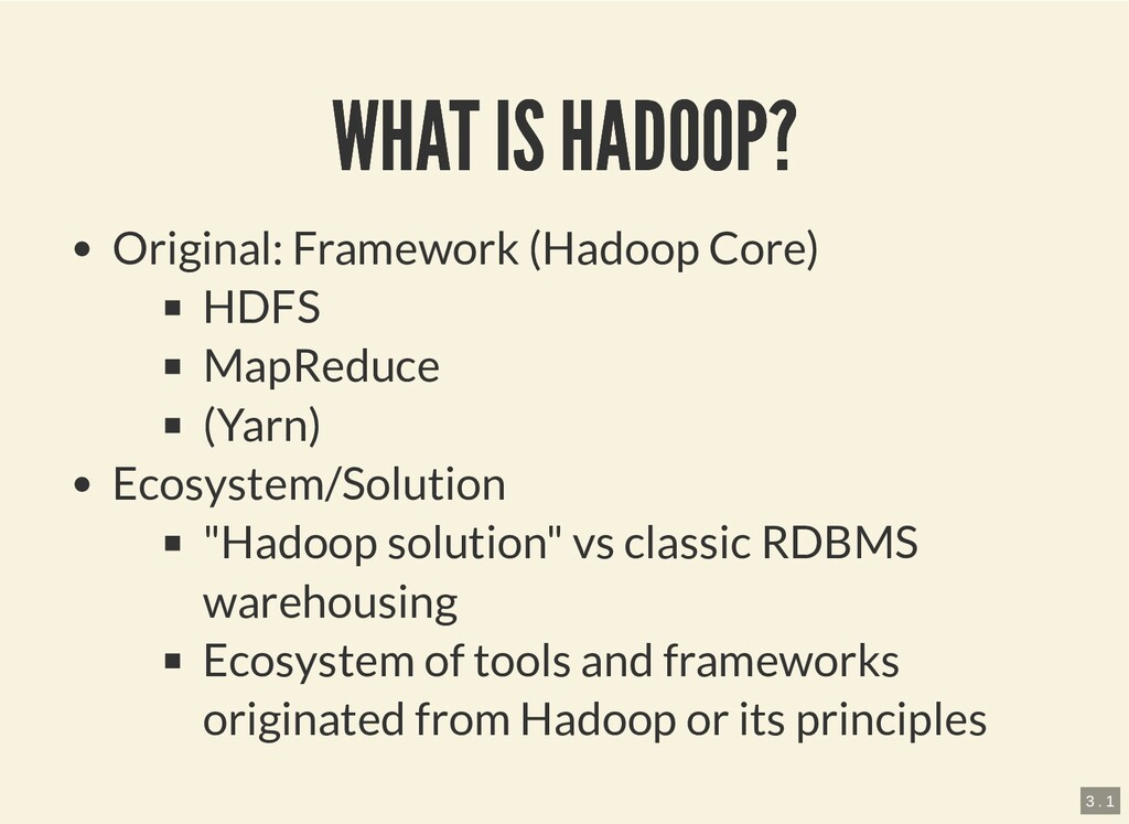 HDFS MapReduce (Yarn) Ecosystem/Solution "Hadoop solution" vs classic RDBMS warehousing Ecosystem of tools and frameworks originated from Hadoop or its principles 3 . 1