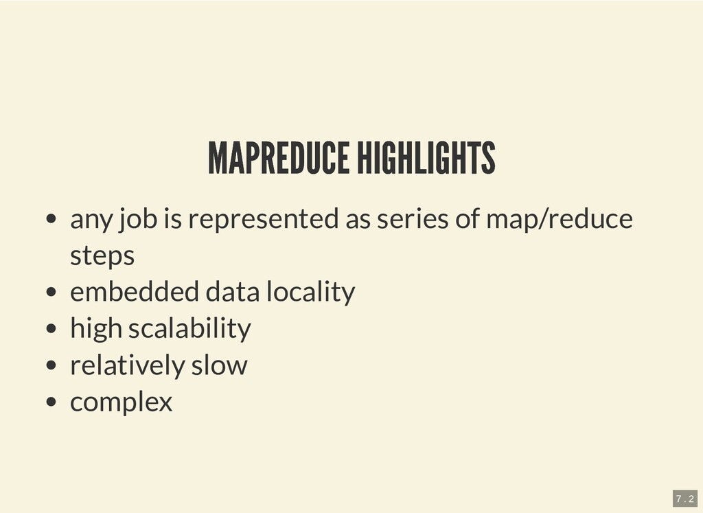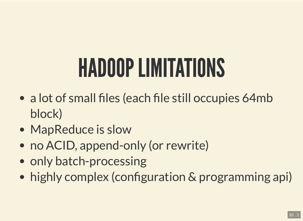 le still occupies 64mb block) MapReduce is slow no ACID, append-only (or rewrite) only batch-processing highly complex (con guration & programming api) 10 . 1