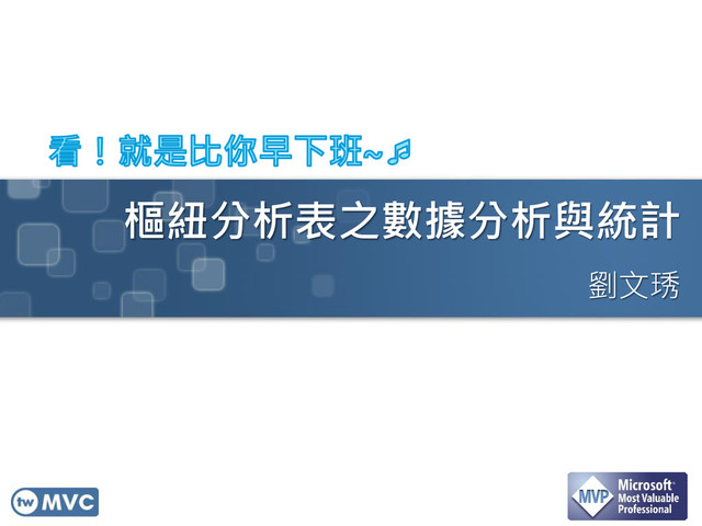 講者:劉文琇(Dolly) (http://excel.com.tw/) 講者簡介:2009世界盃電腦應用技能競賽-世界冠軍 2014 微軟最有價值專家(MVP) MOS認證權威 TQC OFFICE認證,更詳細的介紹。 著作:看!就是比你早下班:Excel函數字典速查UP!