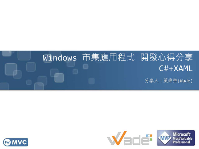 隨著Windows上市與熱賣,Windows市集應用程式開始如雨後春筍般逐漸增多,想跟上這股熱潮嗎? twMVC與你分享Windows市集應用程式的開發說明與開發心得,減少你摸索新技術的時間,降底入門的門檻。因為twMVC的成員都是開發人員,主要都是分享開發面的技術,不會分享UI設計面,在當天有準備小彩蛋分享給報名的學員。