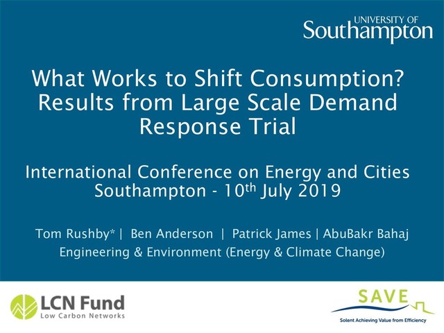 Presentation on Solent Achieving Value from Efficiency (SAVE) project results given at the International Conference on Energy and Cities 2019. Comparing LED and banded tariff (peak rebate) trial results. What on earth does this all have to do with a time machine from a classic 80s movie?