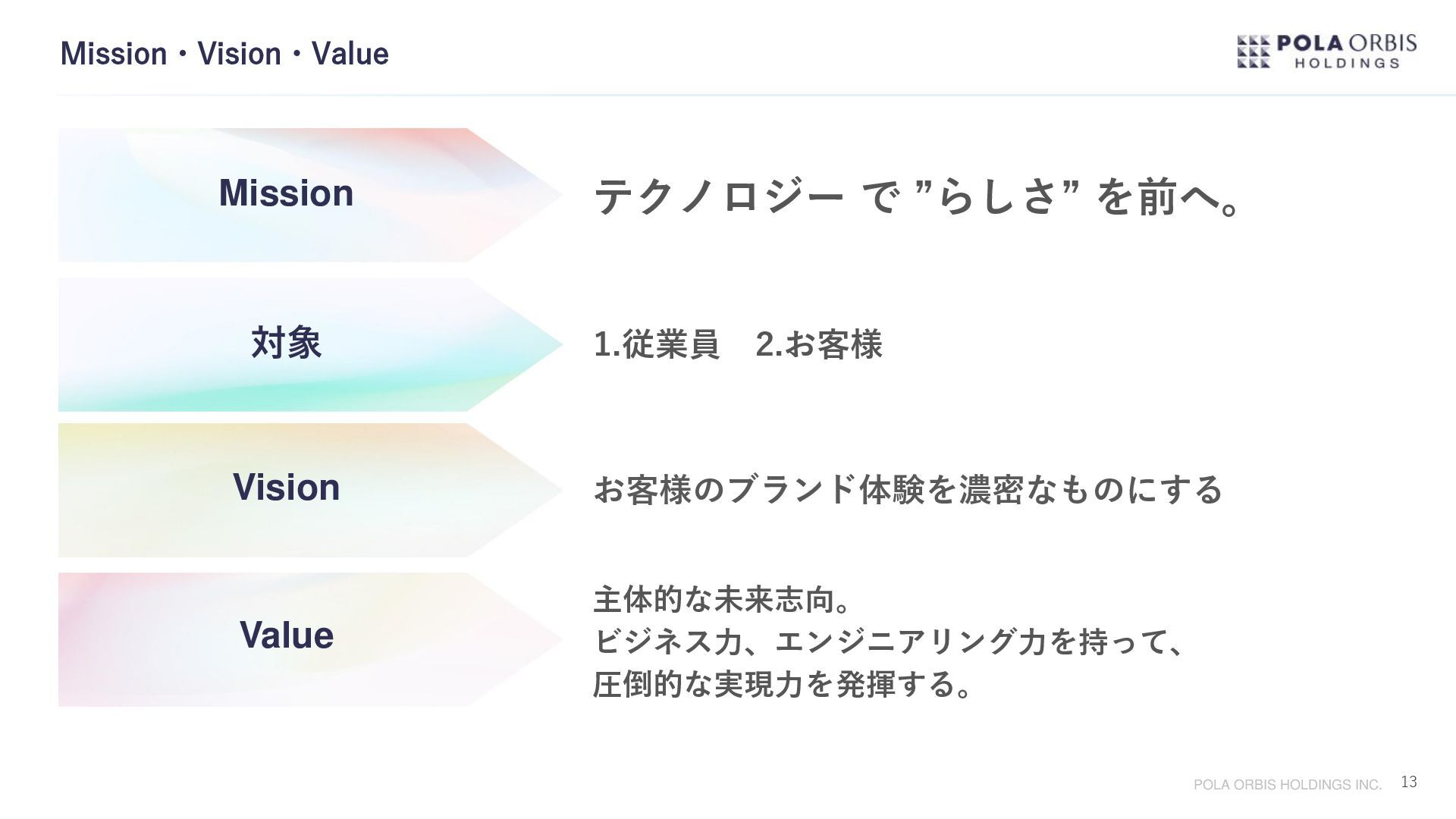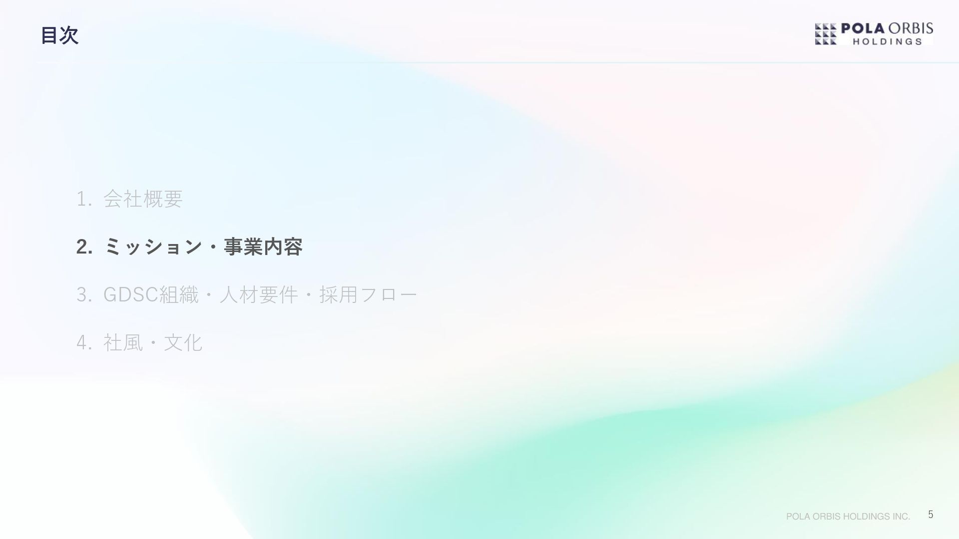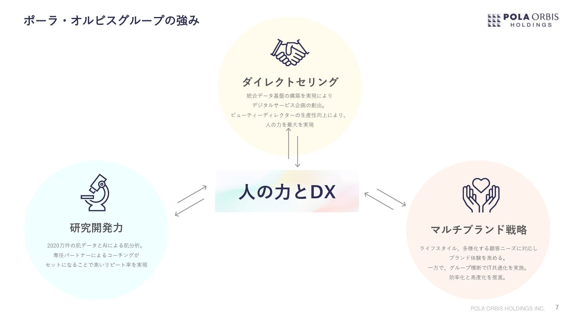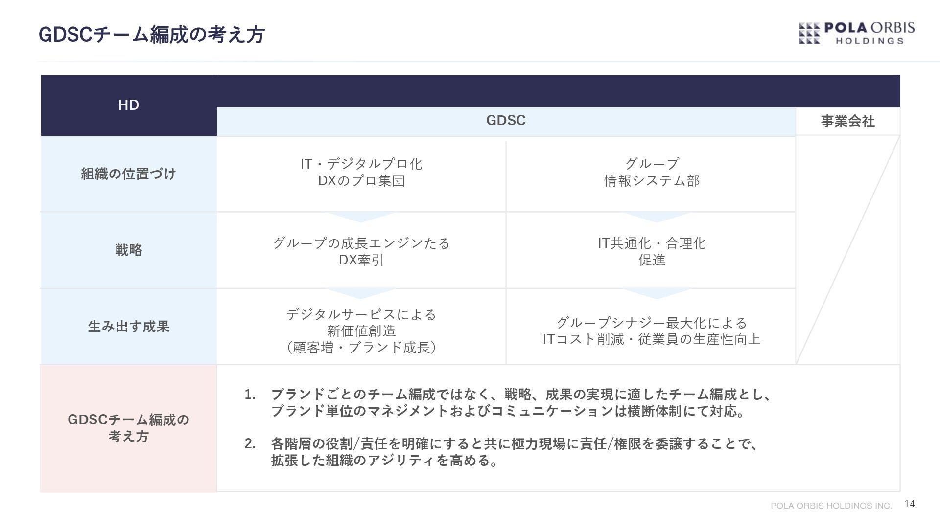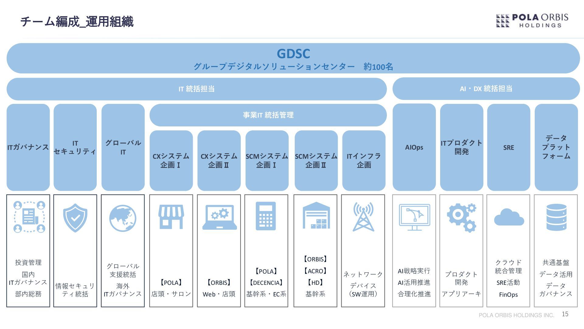 グループシナジーを最大限発揮すべく、グループ全体のDX加速、グループIT合理化を両輪に 2022年4月グループ デジタル ソリューション センターを設立。 今後新規事業創出によりブランドポートフォリオがさらに拡充していく事を踏まえ、 どのブランドもデジタル活用を前提とした顧客の創出と維持ができる状態を作っていきたい。 一方でブランドのノンコア領域に対してはIT共通化による徹底的な合理化を進めたい。 このメリハリを実現する事で個性あふれるブランド群の確実な成長と、収益力を高めていきたい。 専門性、市場価値の高い能力を集約組織で醸成し、それを各事業に継続的に還元し続ける事で 今後一層拡充される全事業のDXを加速させ、成長に貢献する。 顧客創出と徹底的な合理化 グループデジタルソリューションセンター(GDSC)設立の想い 1977年生まれ。大学卒業後、2000年にポーラ化粧品本舗(現:ポーラ)へ 入社。情報システム部門にて全国店舗のIT環境整備、基幹システムの刷新 など手掛ける。2015年よりポーラ・オルビスホールディングスへ転籍し、 P.Oグループ全体のITガバナンスを強化すべく2017年にはコーポレートIT 企画室を設立し室長へ就任。さらにその後、P.Oグループ全体のDX加速、 IT合理化を進めるべくP.Oグループ内のIT部門を再編しGDSCを設立すると 共に所長へ就任。