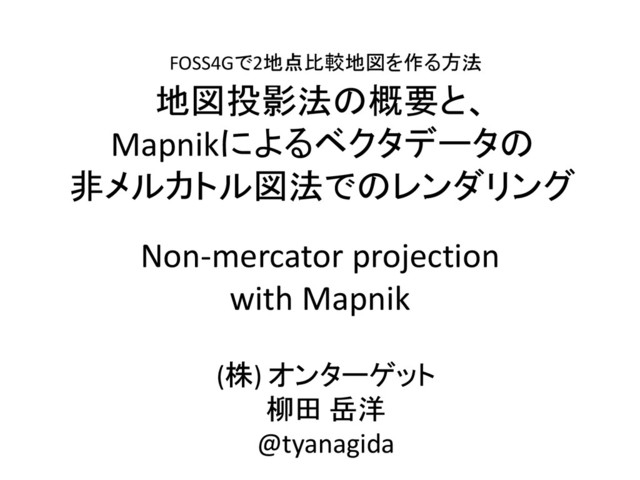 Non-mercator projection with Mapnik (株) オンターゲット 柳田 岳洋 @tyanagida FOSS4Gで2地点比較地図を作る方法