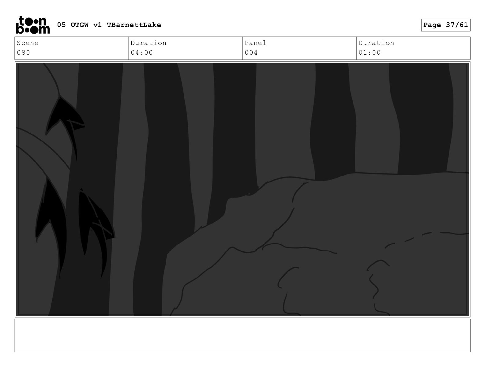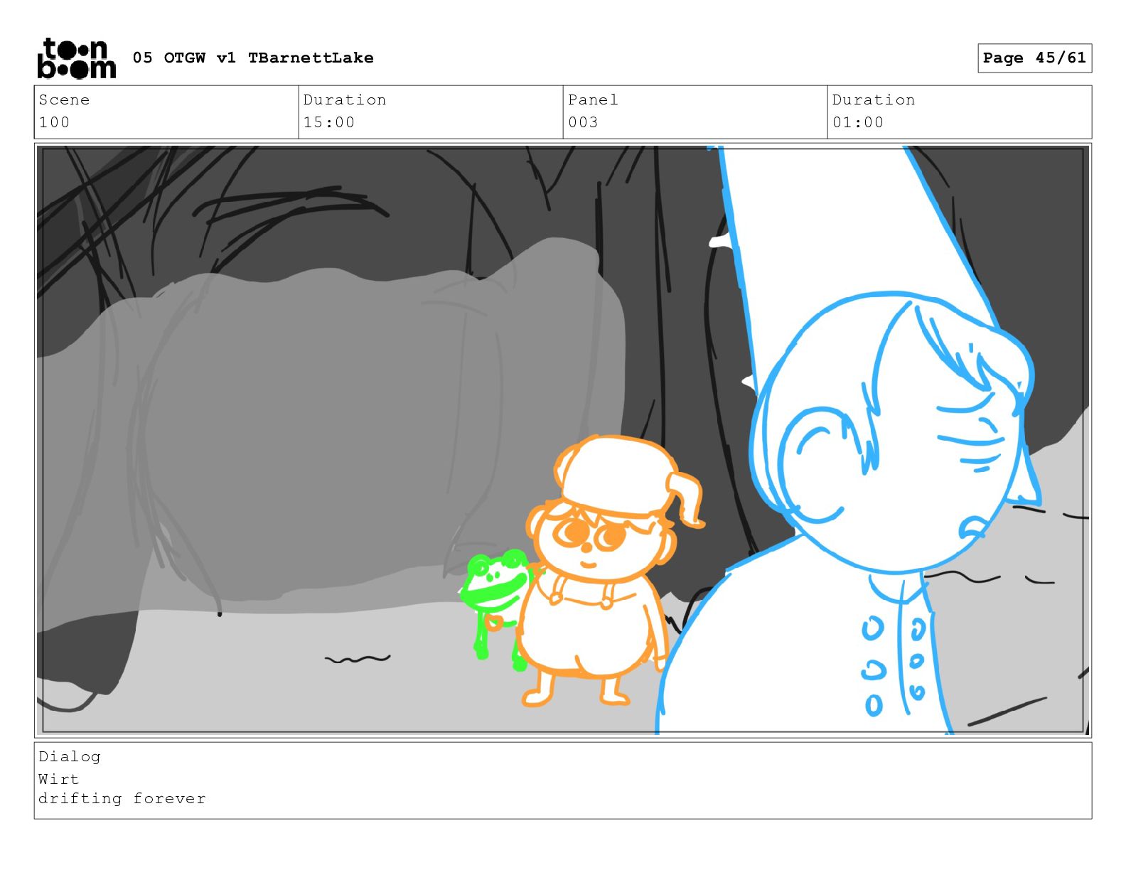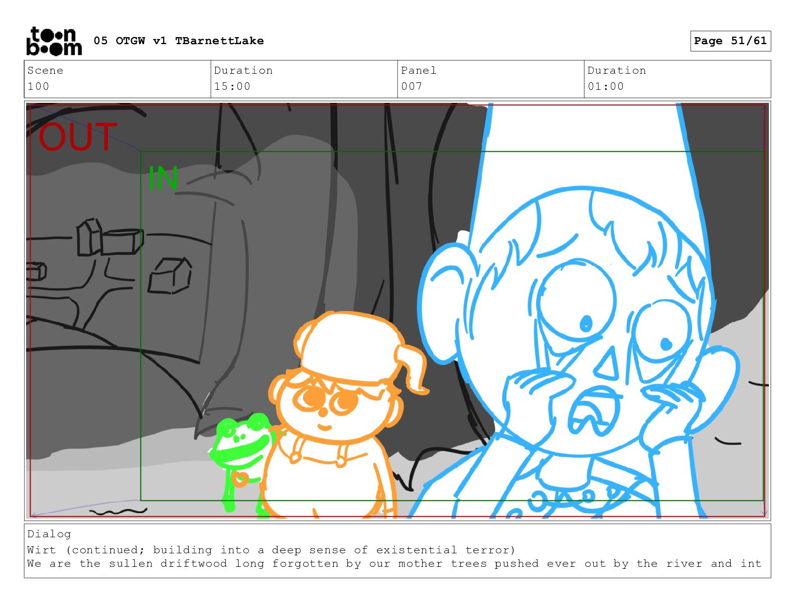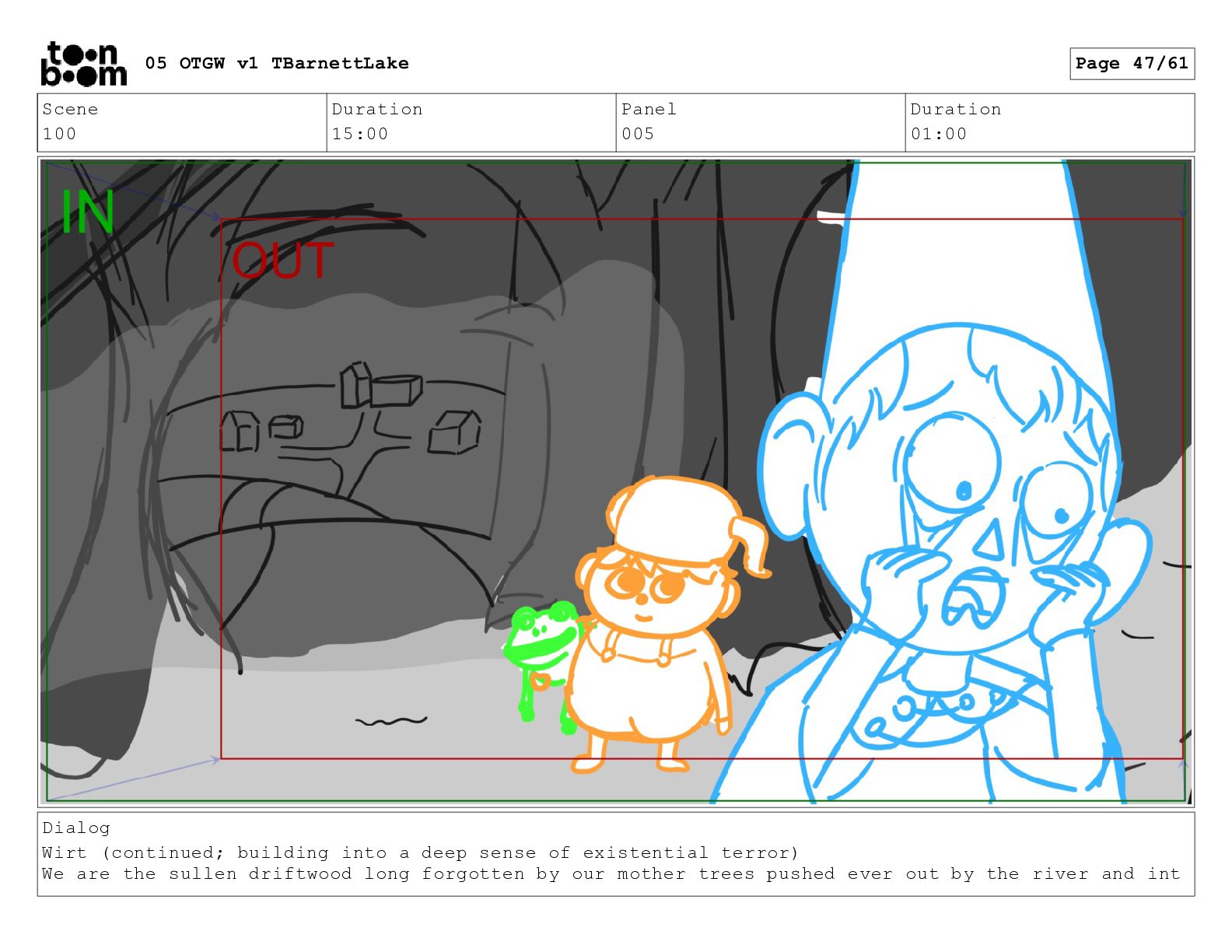(continued; building into a deep sense of existential terror) We are the sullen driftwood long forgotten by our mother trees pushed ever out by the river and int 05 OTGW v1 TBarnettLake Page 47/61