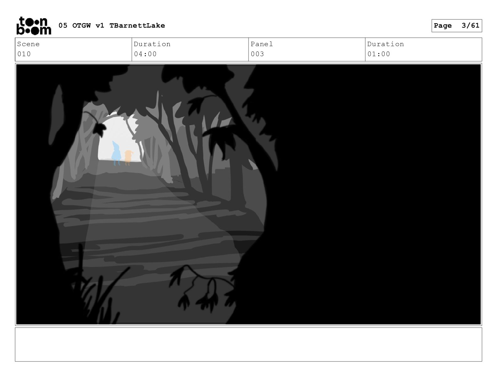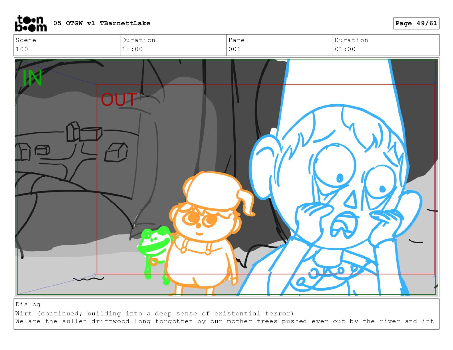 (continued; building into a deep sense of existential terror) We are the sullen driftwood long forgotten by our mother trees pushed ever out by the river and int 05 OTGW v1 TBarnettLake Page 49/61