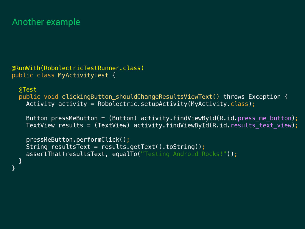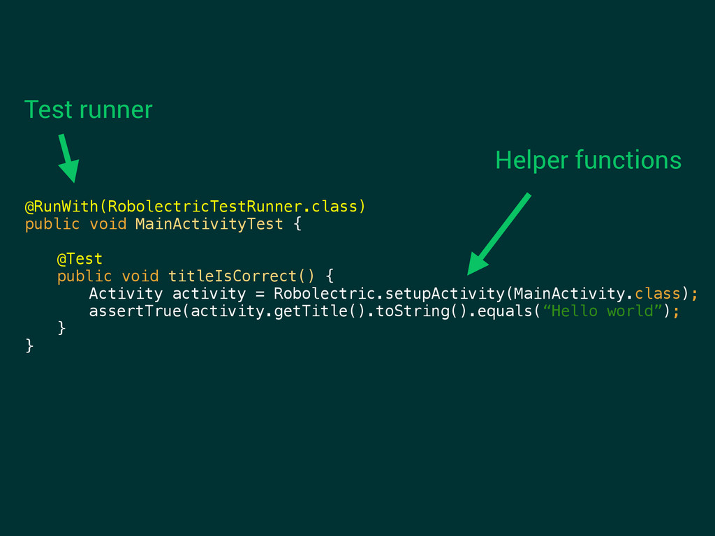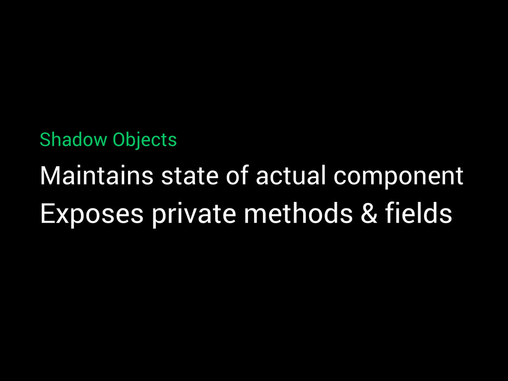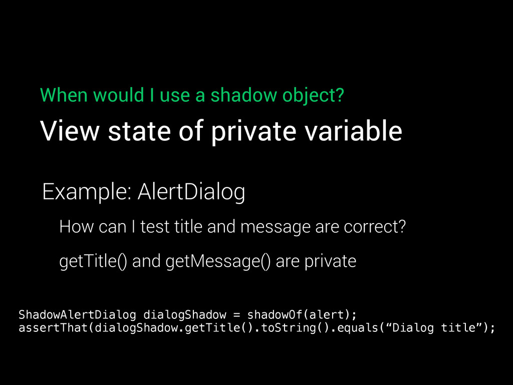 private variable Example: AlertDialog How can I test title and message are correct? getTitle() and getMessage() are private ShadowAlertDialog dialogShadow = shadowOf(alert); assertThat(dialogShadow.getTitle().toString().equals(“Dialog title”);
