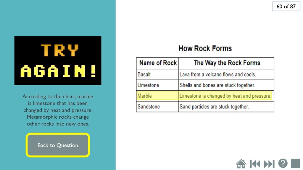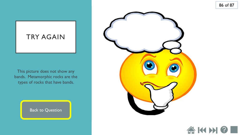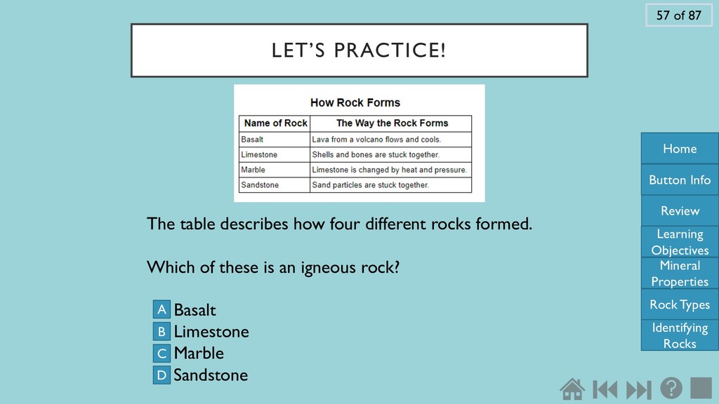 physical, observable properties to identify rock types. Look at this rock. Does it have layers? No Does it have bands or stripes? Yes, there are some visible bands Does it have light and dark minerals? Yes, but not speckled Then this rock is metamorphic! This metamorphic rock is called gneiss. Extreme heat and pressure morphed, or changed, granite into this rock. Home Button Info Review Learning Objectives Mineral Properties Rock Types Identifying Rocks 70 of 87