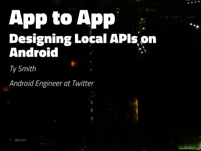 Designing an elegant interface and local APIs for developers to communicate with your Android app is crucial for building a platform for your product: in this talk, you’ll find out how to allow third party developers to seamlessly interact with your users’ local data and shortcut more expensive server operations. Topics will include creating and exporting your content provider, constructing a well defined Intent interface, use deep links, and bind services for programmatic communication. Ty will walk you through how to create a well-defined interface in your app – if that’s something you want to know, don’t miss it!