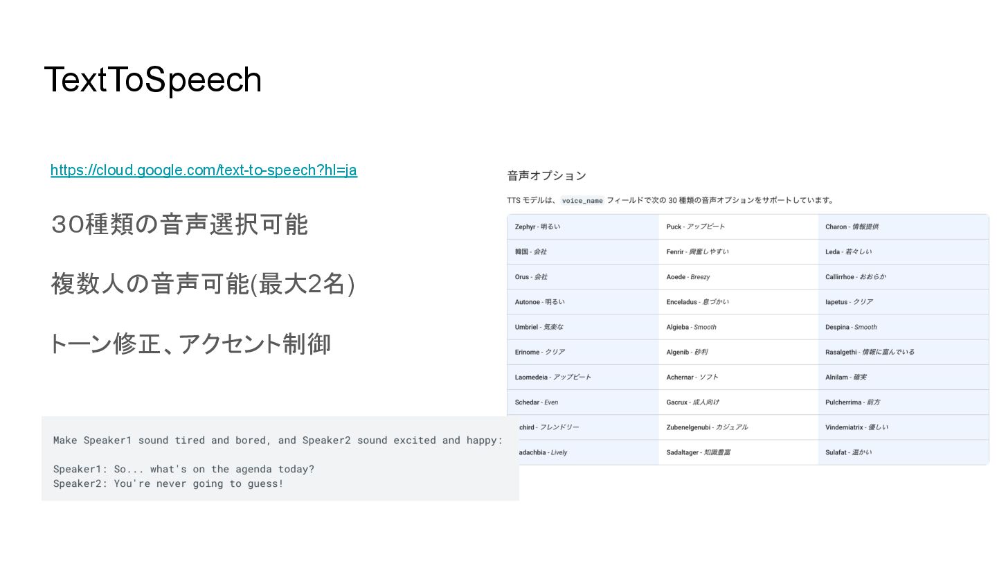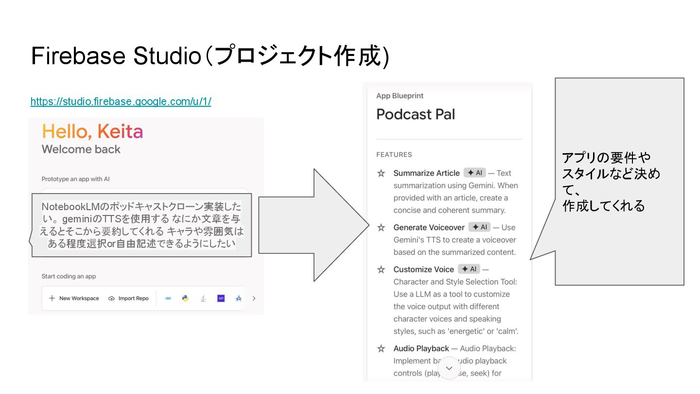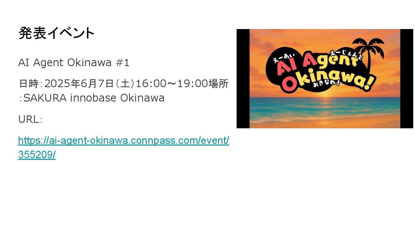 2025.6.7 のAIAgentOkinawa#1で発表したスライドになります。 AIAgentOkinawaは、沖縄で活動するエンジニア同士が、AI Agentに関する知識を高め合い、技術を共有し合うLT(ライトニングトーク)形式の勉強会です。 GeminiのTTS(Text to Speach)を用いて何らかのドキュメントやサイトを音声化するアプリを作成しました。 Firebase Studioを用いて開発からディプロイまで実施しました。