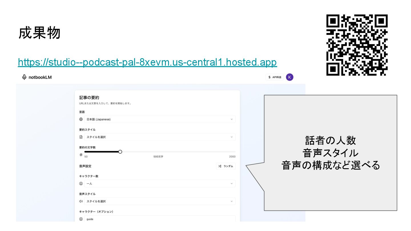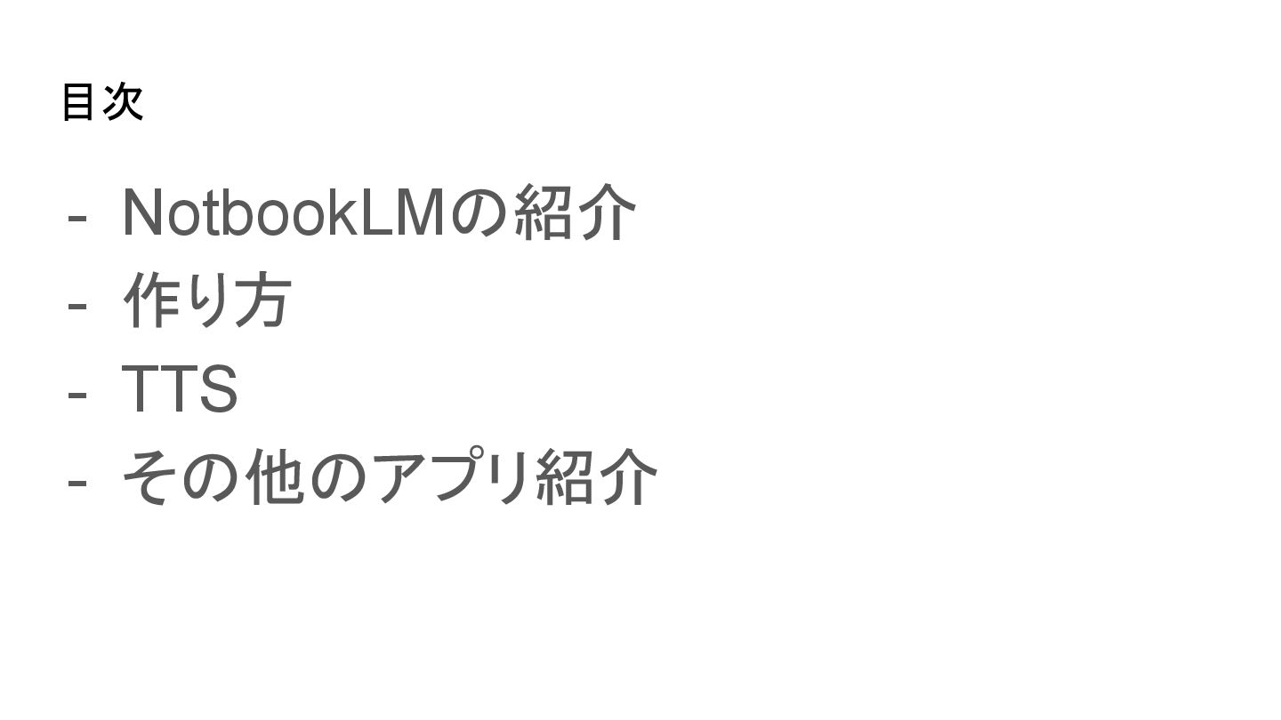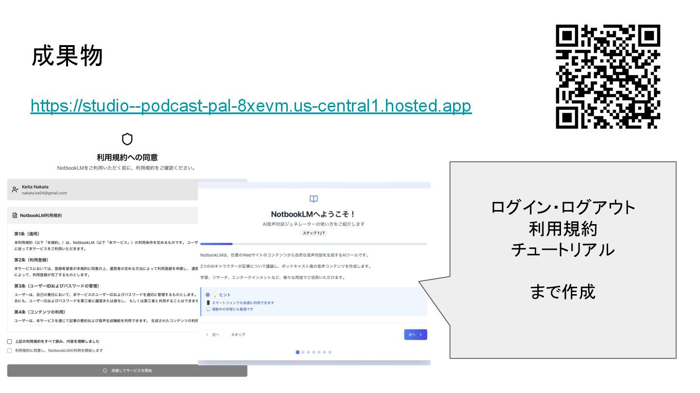 2025.6.7 のAIAgentOkinawa#1で発表したスライドになります。 AIAgentOkinawaは、沖縄で活動するエンジニア同士が、AI Agentに関する知識を高め合い、技術を共有し合うLT(ライトニングトーク)形式の勉強会です。 GeminiのTTS(Text to Speach)を用いて何らかのドキュメントやサイトを音声化するアプリを作成しました。 Firebase Studioを用いて開発からディプロイまで実施しました。