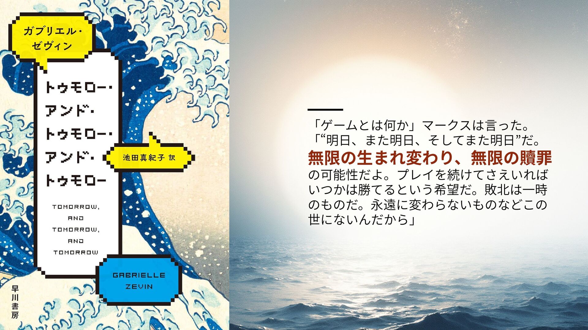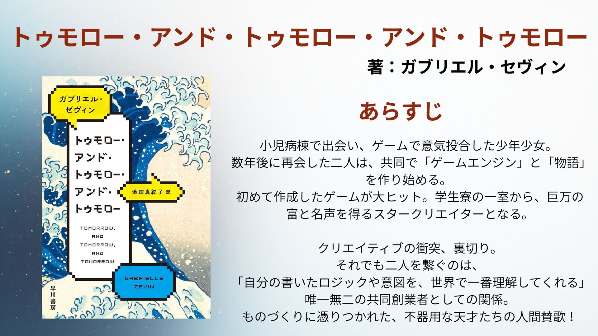 トゥモロー・アンド・トゥモロー・アンド・トゥモロー 著:ガブリエル・セヴィン あらすじ 小児病棟で出会い、ゲームで意気投合した少年少女。 数年後に再会した二人は、共同で「ゲームエンジン」と「物語」 を作り始める。 初めて作成したゲームが大ヒット。学生寮の一室から、巨万の 富と名声を得るスタークリエイターとなる。 クリエイティブの衝突、裏切り。 それでも二人を繋ぐのは、