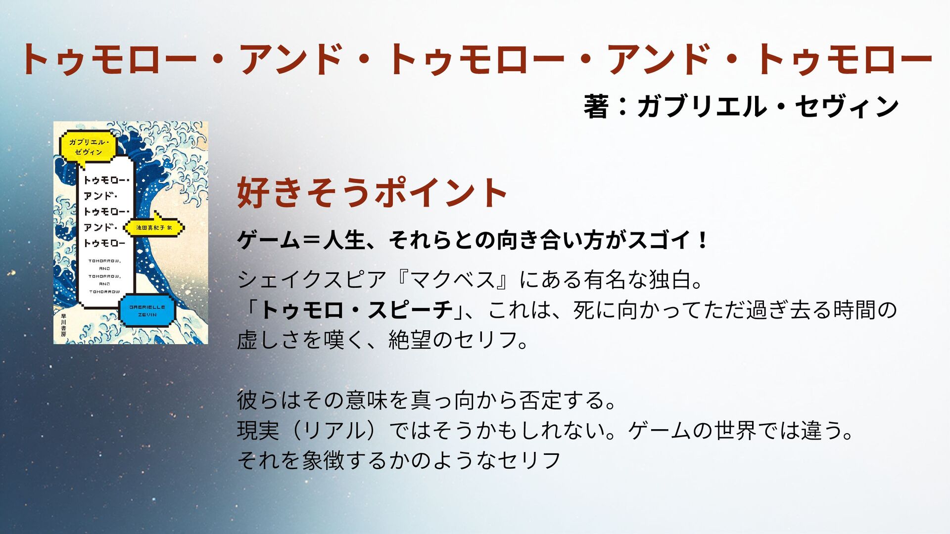 好きそうポイント ゲーム=人生、それらとの向き合い方がスゴイ! シェイクスピア『マクベス』にある有名な独白。 「トゥモロ・スピーチ」 、これは、死に向かってただ過ぎ去る時間の 虚しさを嘆く、絶望のセリフ。 彼らはその意味を真っ向から否定する。 現実(リアル)ではそうかもしれない。ゲームの世界では違う。 それを象徴するかのようなセリフ トゥモロー・アンド・トゥモロー・アンド・トゥモロー
