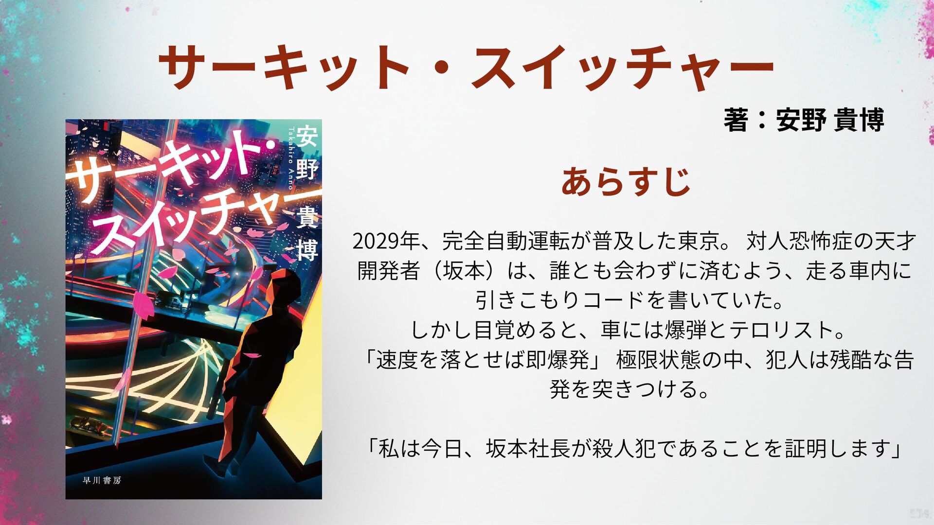 サーキット・スイッチャー 著:安野 貴博 あらすじ 2029年、完全自動運転が普及した東京。 対人恐怖症の天才 開発者(坂本)は、誰とも会わずに済むよう、走る車内に 引きこもりコードを書いていた。 しかし目覚めると、車には爆弾とテロリスト。 「速度を落とせば即爆発」