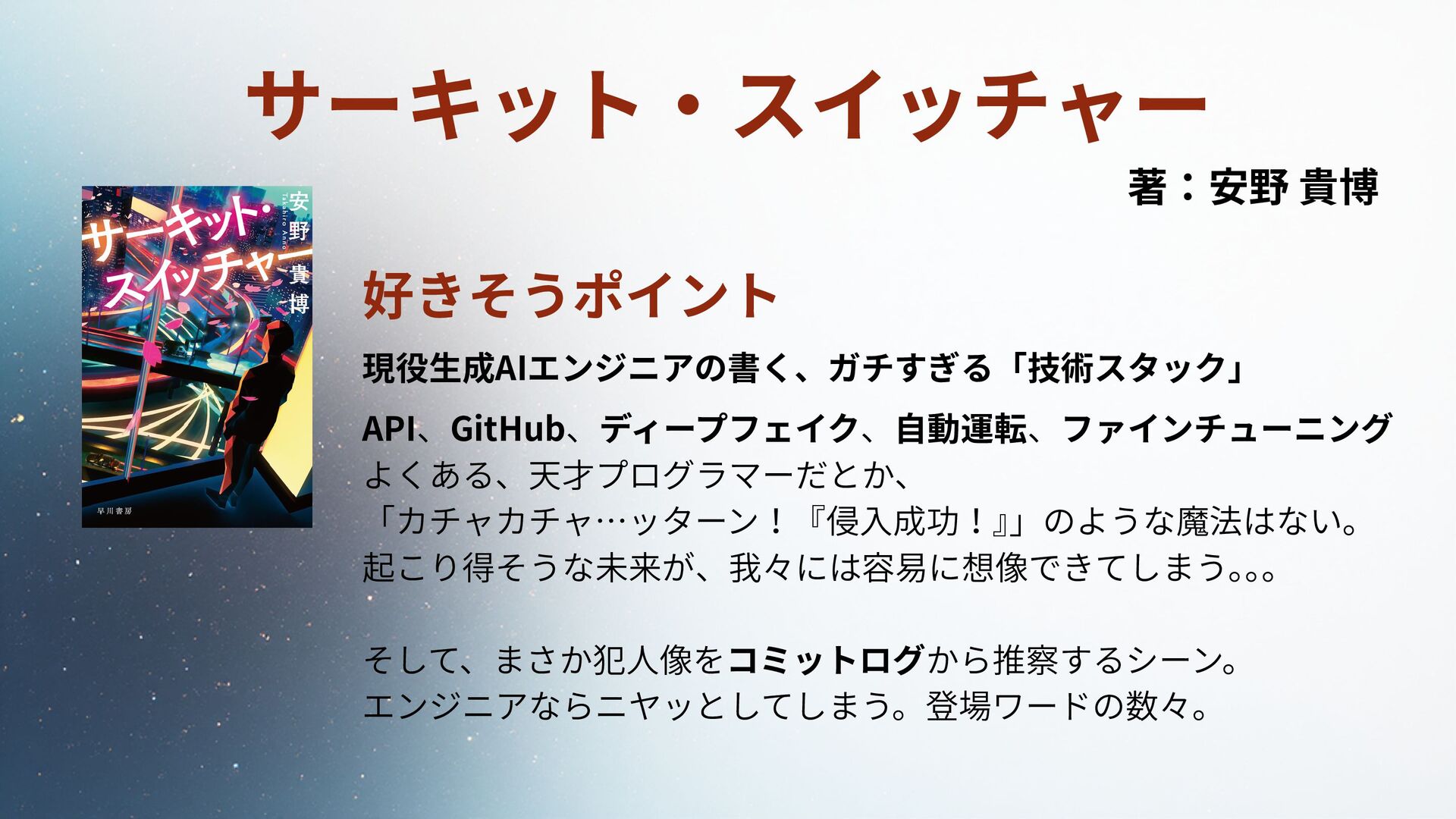 好きそうポイント 現役生成AIエンジニアの書く、ガチすぎる「技術スタック」 API、GitHub、ディープフェイク、自動運転、ファインチューニング よくある、天才プログラマーだとか、 「カチャカチャ…ッターン!『侵入成功!』 」のような魔法はない。 起こり得そうな未来が、我々には容易に想像できてしまう。 。 。 そして、まさか犯人像をコミットログから推察するシーン。