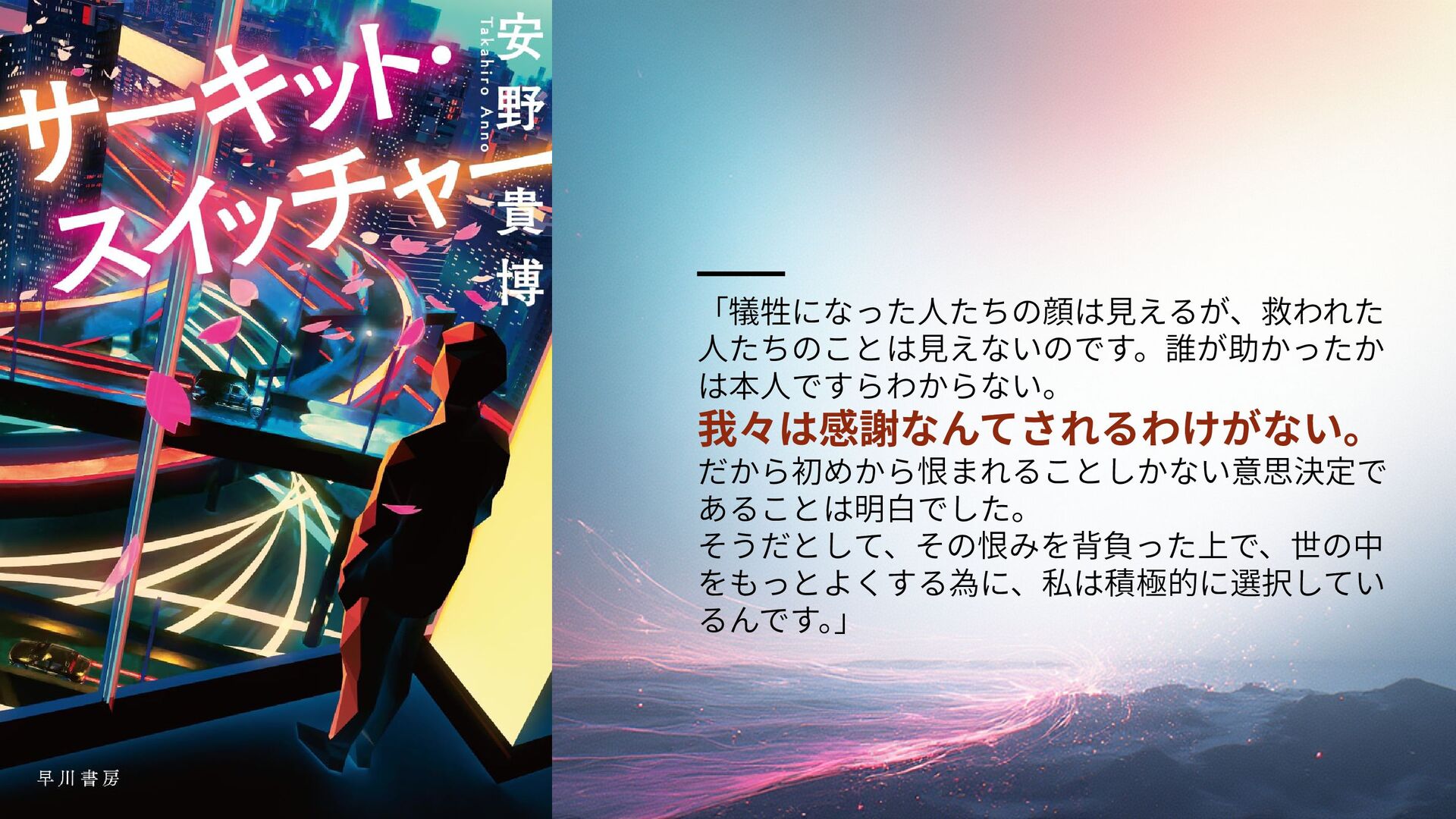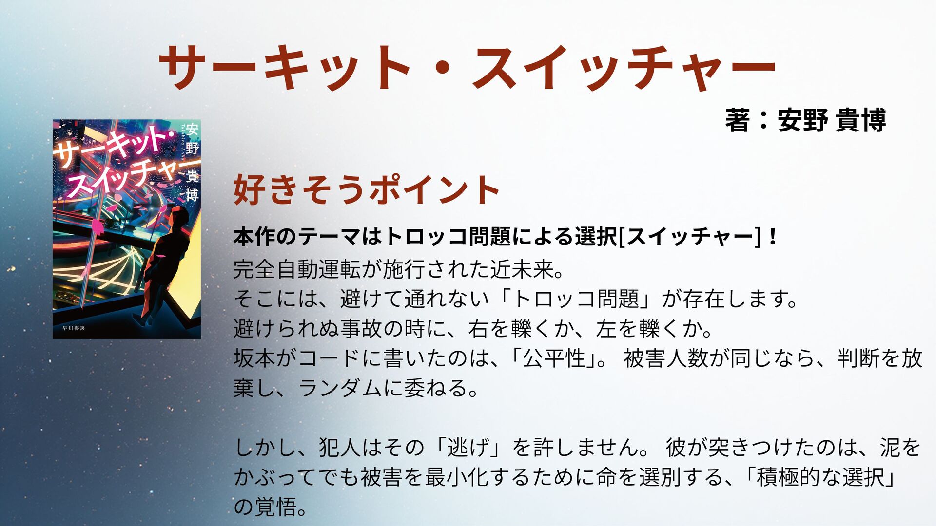 しかし、犯人はその「逃げ」を許しません。 彼が突きつけたのは、泥を かぶってでも被害を最小化するために命を選別する、 「積極的な選択」 の覚悟。 サーキット・スイッチャー 著:安野 貴博