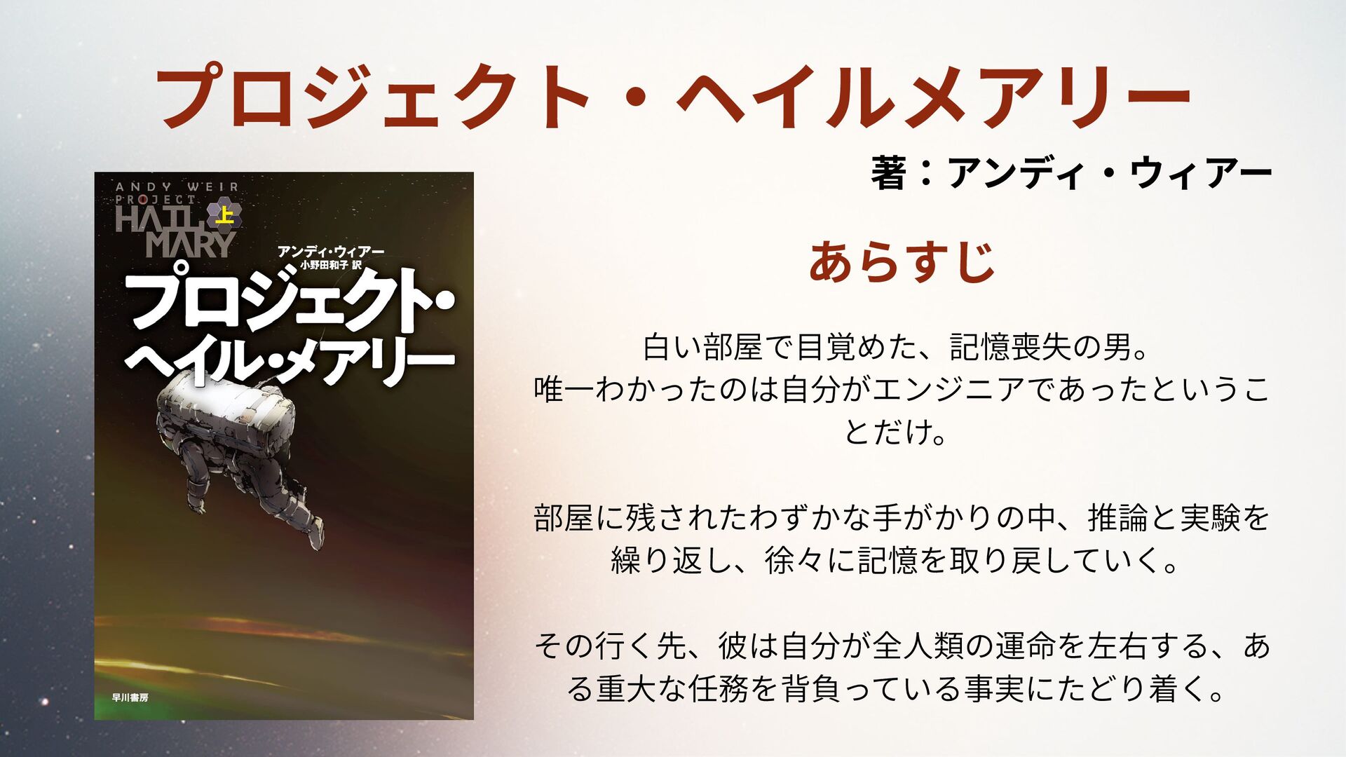 プロジェクト・ヘイルメアリー 著:アンディ・ウィアー あらすじ 白い部屋で目覚めた、記憶喪失の男。 唯一わかったのは自分がエンジニアであったというこ とだけ。 部屋に残されたわずかな手がかりの中、推論と実験を 繰り返し、徐々に記憶を取り戻していく。 その行く先、彼は自分が全人類の運命を左右する、あ る重大な任務を背負っている事実にたどり着く。