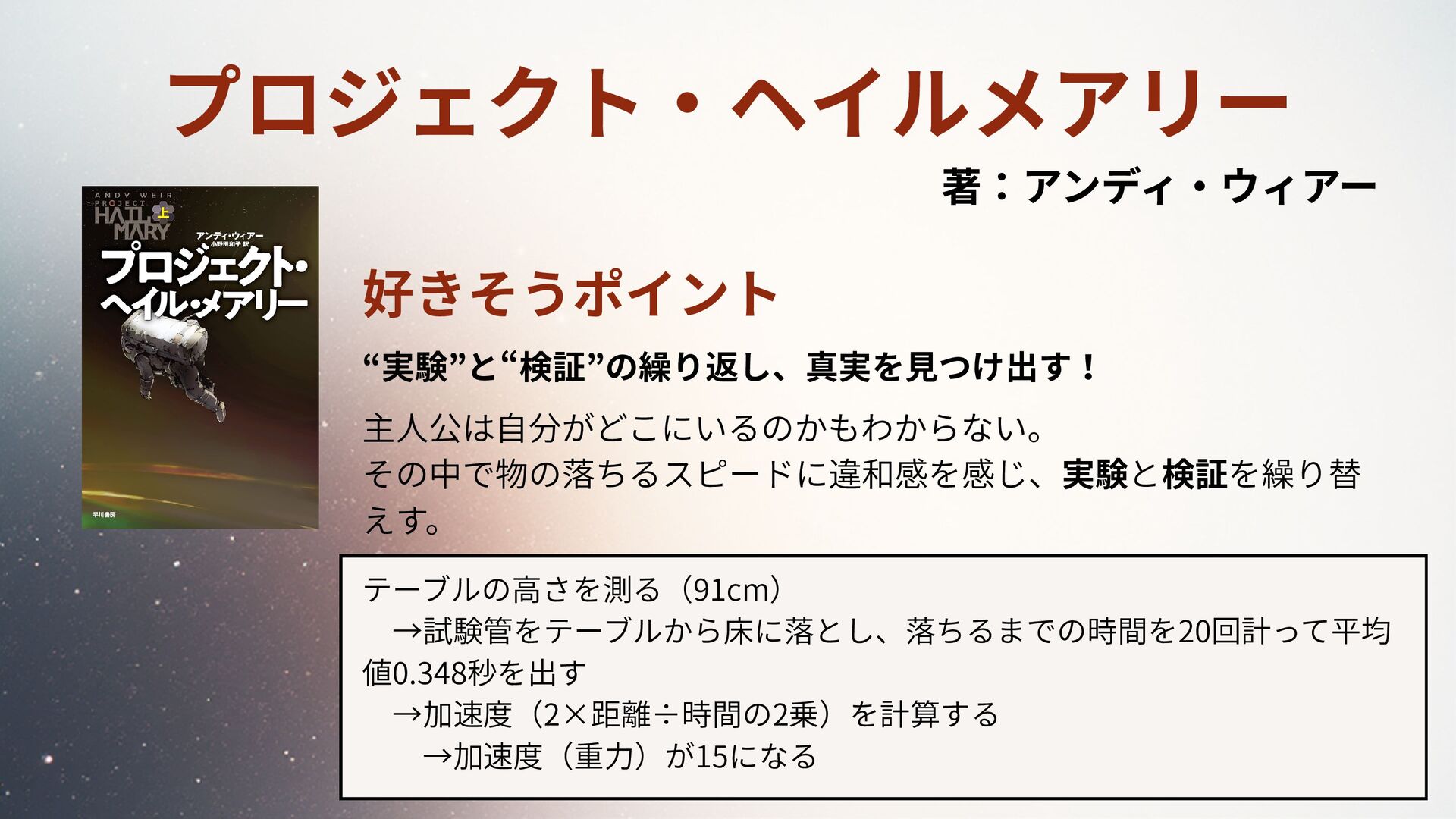 プロジェクト・ヘイルメアリー 好きそうポイント “実験”と“検証”の繰り返し、真実を見つけ出す! 主人公は自分がどこにいるのかもわからない。 その中で物の落ちるスピードに違和感を感じ、実験と検証を繰り替 えす。 著:アンディ・ウィアー テーブルの高さを測る(91cm) →試験管をテーブルから床に落とし、落ちるまでの時間を20回計って平均 値0.348秒を出す