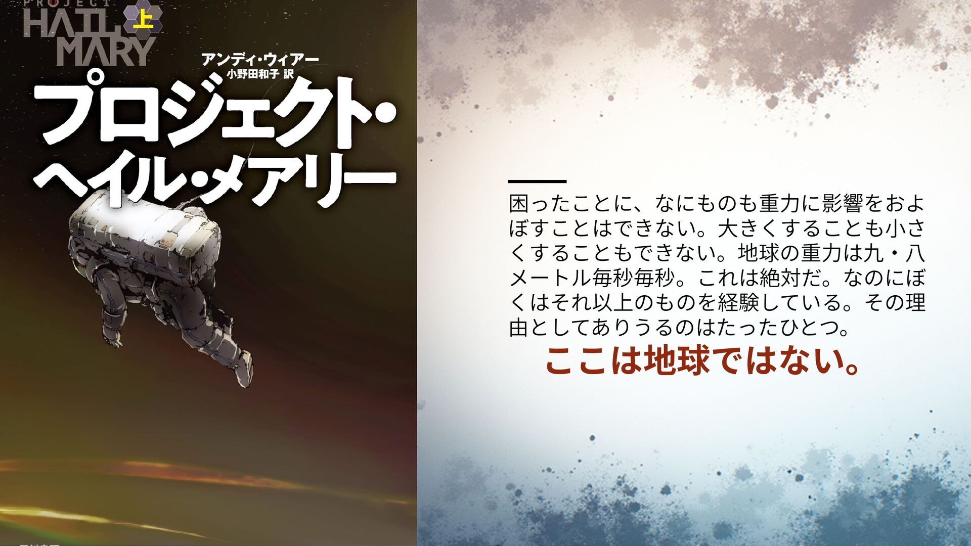 困ったことに、なにものも重力に影響をおよ ぼすことはできない。大きくすることも小さ くすることもできない。地球の重力は九・八 メートル毎秒毎秒。これは絶対だ。なのにぼ くはそれ以上のものを経験している。その理 由としてありうるのはたったひとつ。 ここは地球ではない。
