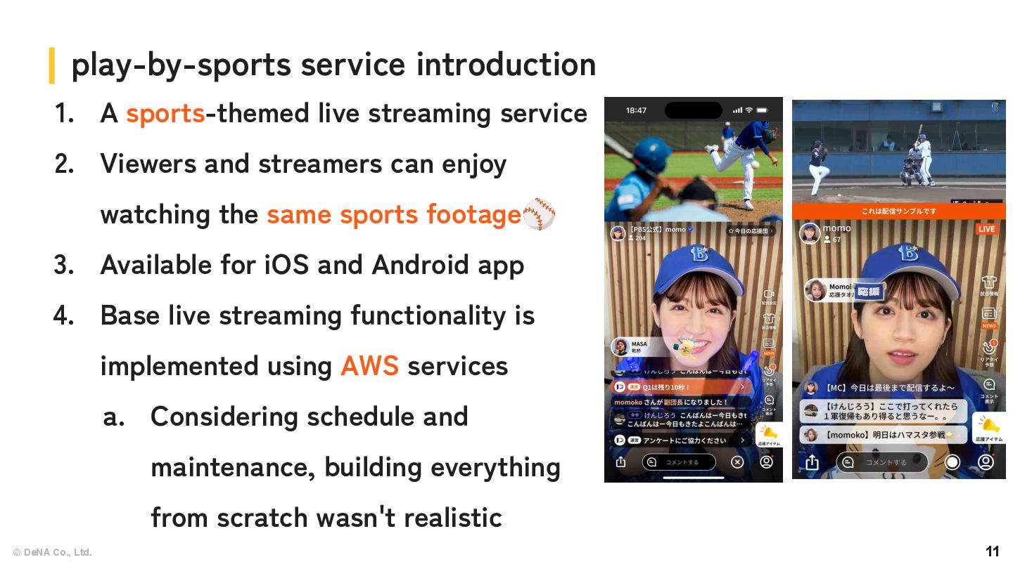 sports-themed live streaming service 2. Viewers and streamers can enjoy watching the same sports footage⚾ 3. Available for iOS and Android app 4. Base live streaming functionality is implemented using AWS services a. Considering schedule and maintenance, building everything from scratch wasn't realistic