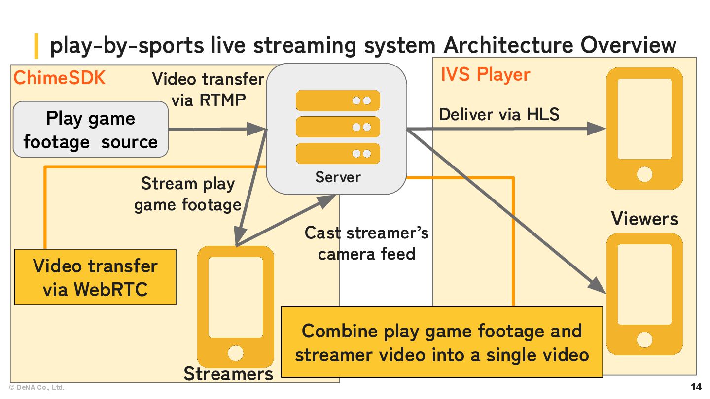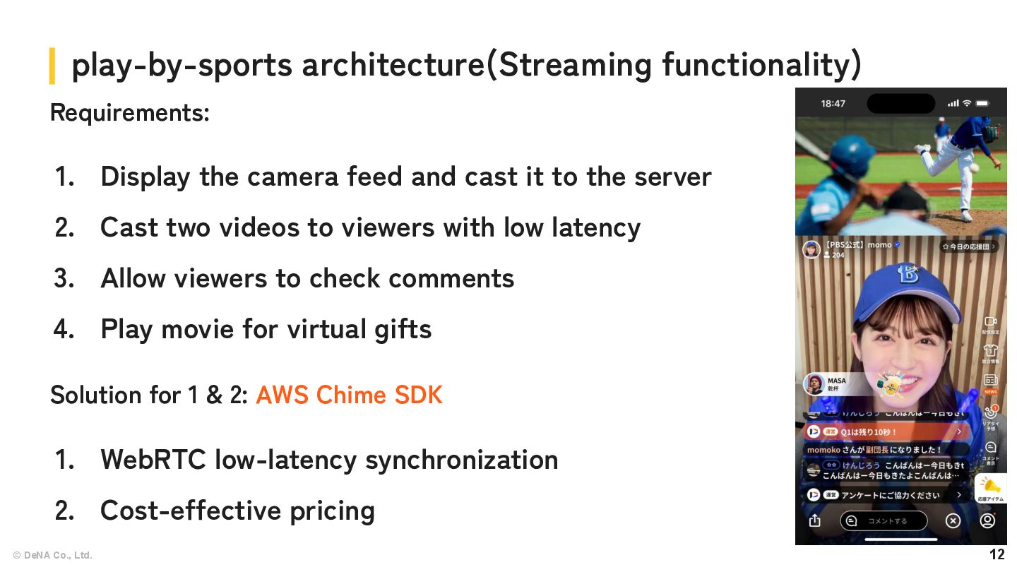feed and cast it to the server 2. Cast two videos to viewers with low latency 3. Allow viewers to check comments 4. Play movie for virtual gifts Solution for 1 & 2: AWS Chime SDK 1. WebRTC low-latency synchronization 2. Cost-effective pricing play-by-sports architecture(Streaming functionality)