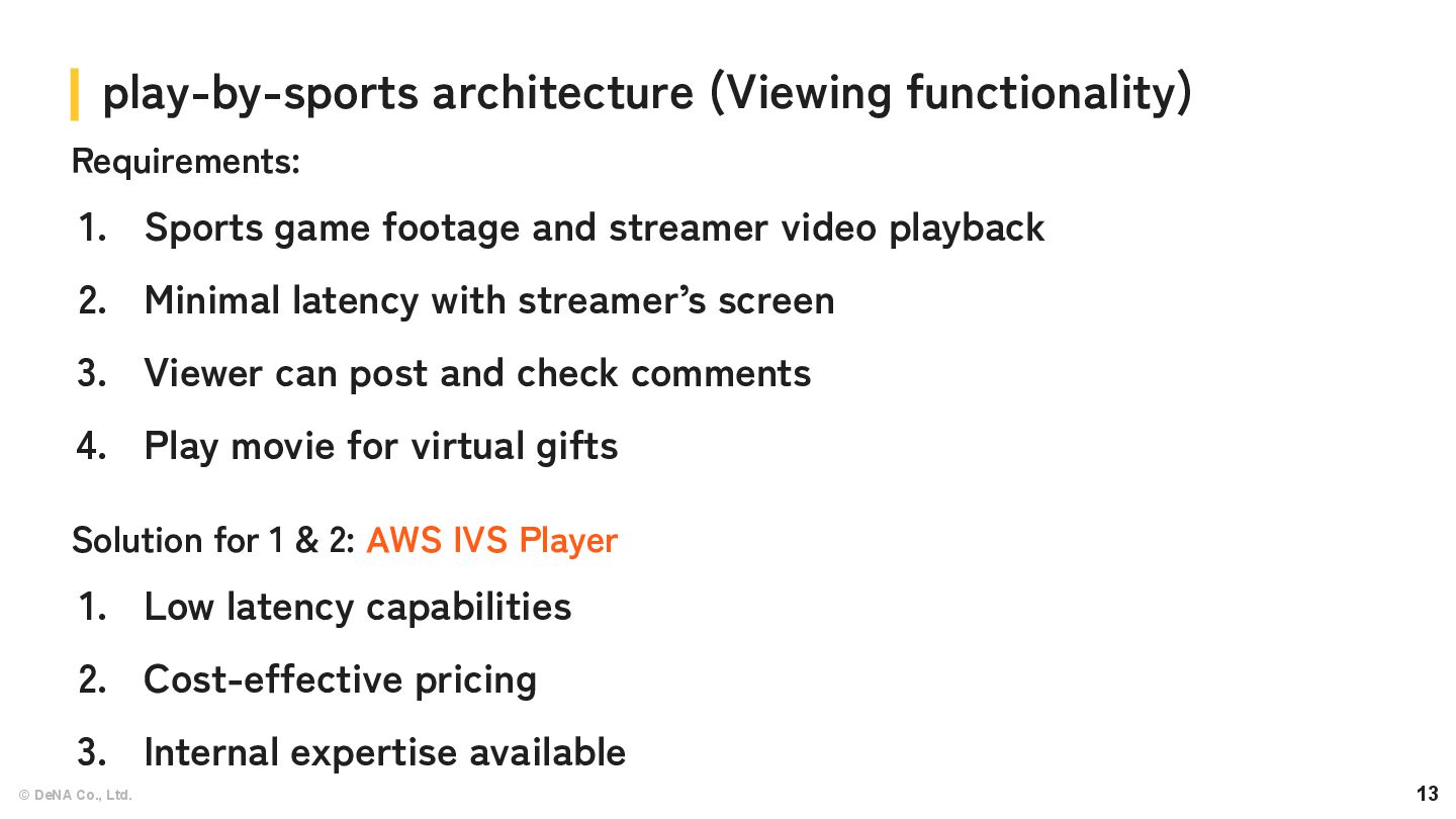 and streamer video playback 2. Minimal latency with streamer’s screen 3. Viewer can post and check comments 4. Play movie for virtual gifts Solution for 1 & 2: AWS IVS Player 1. Low latency capabilities 2. Cost-effective pricing 3. Internal expertise available play-by-sports architecture (Viewing functionality)