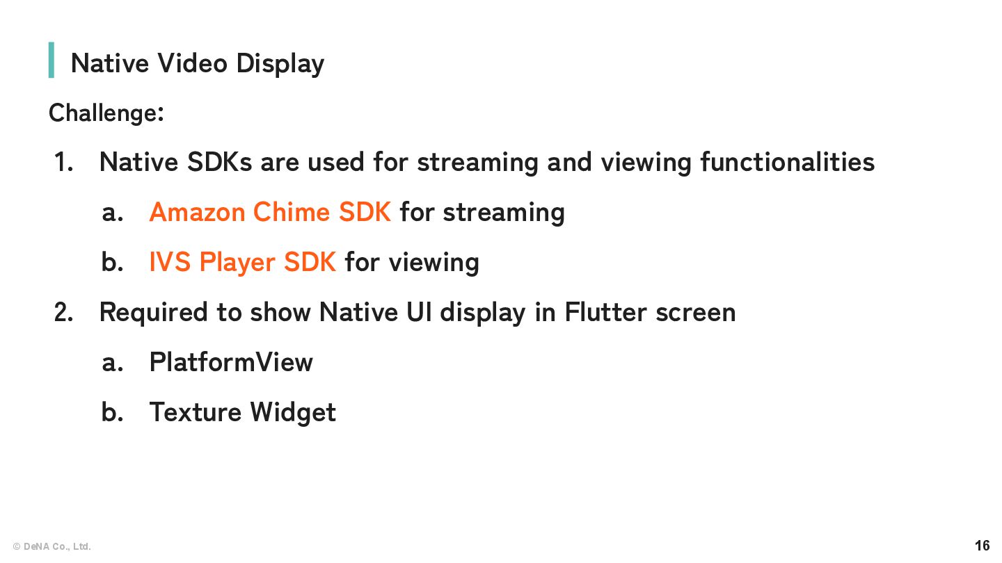 used for streaming and viewing functionalities a. Amazon Chime SDK for streaming b. IVS Player SDK for viewing 2. Required to show Native UI display in Flutter screen a. PlatformView b. Texture Widget Native Video Display