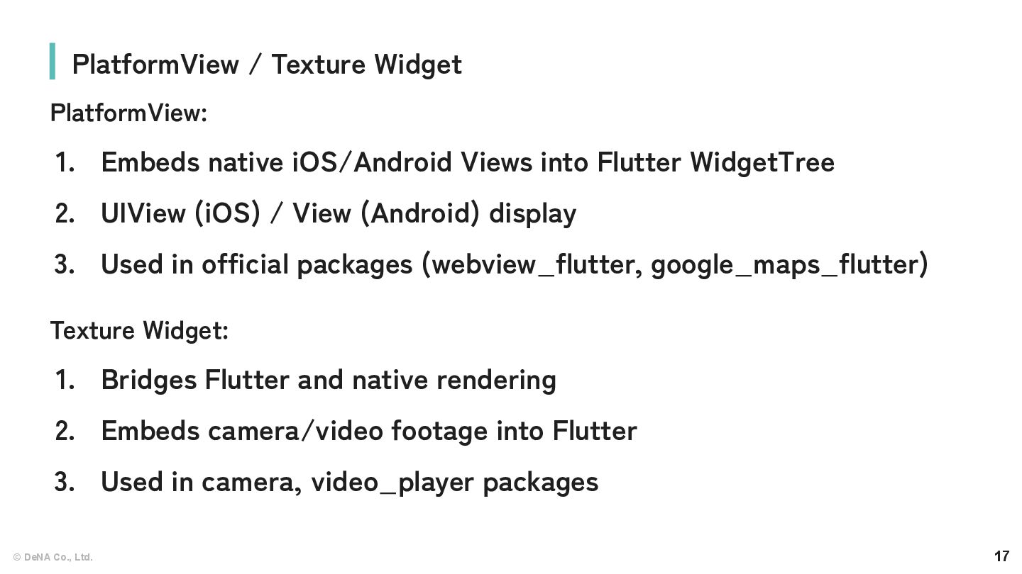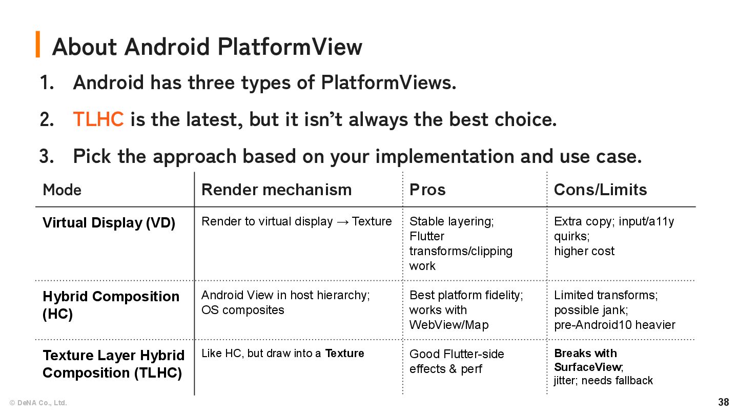 has three types of PlatformViews. 2. TLHC is the latest, but it isn’t always the best choice. 3. Pick the approach based on your implementation and use case. Mode Render mechanism Pros Cons/Limits Virtual Display (VD) Render to virtual display → Texture Stable layering; Flutter transforms/clipping work Extra copy; input/a11y quirks; higher cost Hybrid Composition (HC) Android View in host hierarchy; OS composites Best platform fidelity; works with WebView/Map Limited transforms; possible jank; pre-Android10 heavier Texture Layer Hybrid Composition (TLHC) Like HC, but draw into a Texture Good Flutter-side effects & perf Breaks with SurfaceView; jitter; needs fallback