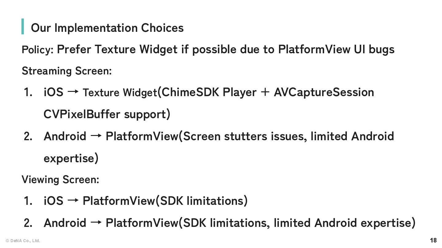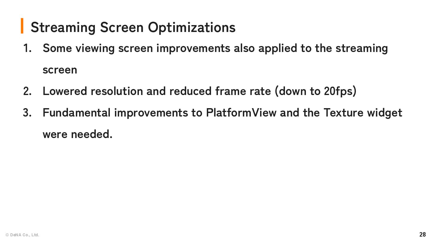 viewing screen improvements also applied to the streaming screen 2. Lowered resolution and reduced frame rate (down to 20fps) 3. Fundamental improvements to PlatformView and the Texture widget were needed.
