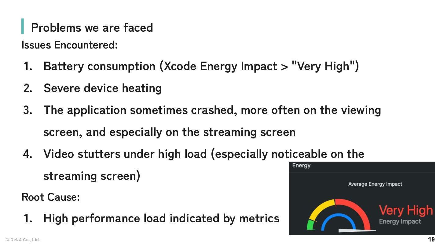 Encountered: 1. Battery consumption (Xcode Energy Impact > "Very High") 2. Severe device heating 3. The application sometimes crashed, more often on the viewing screen, and especially on the streaming screen 4. Video stutters under high load (especially noticeable on the streaming screen) Root Cause: 1. High performance load indicated by metrics