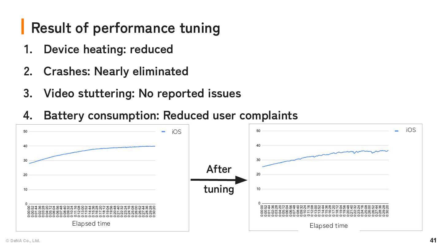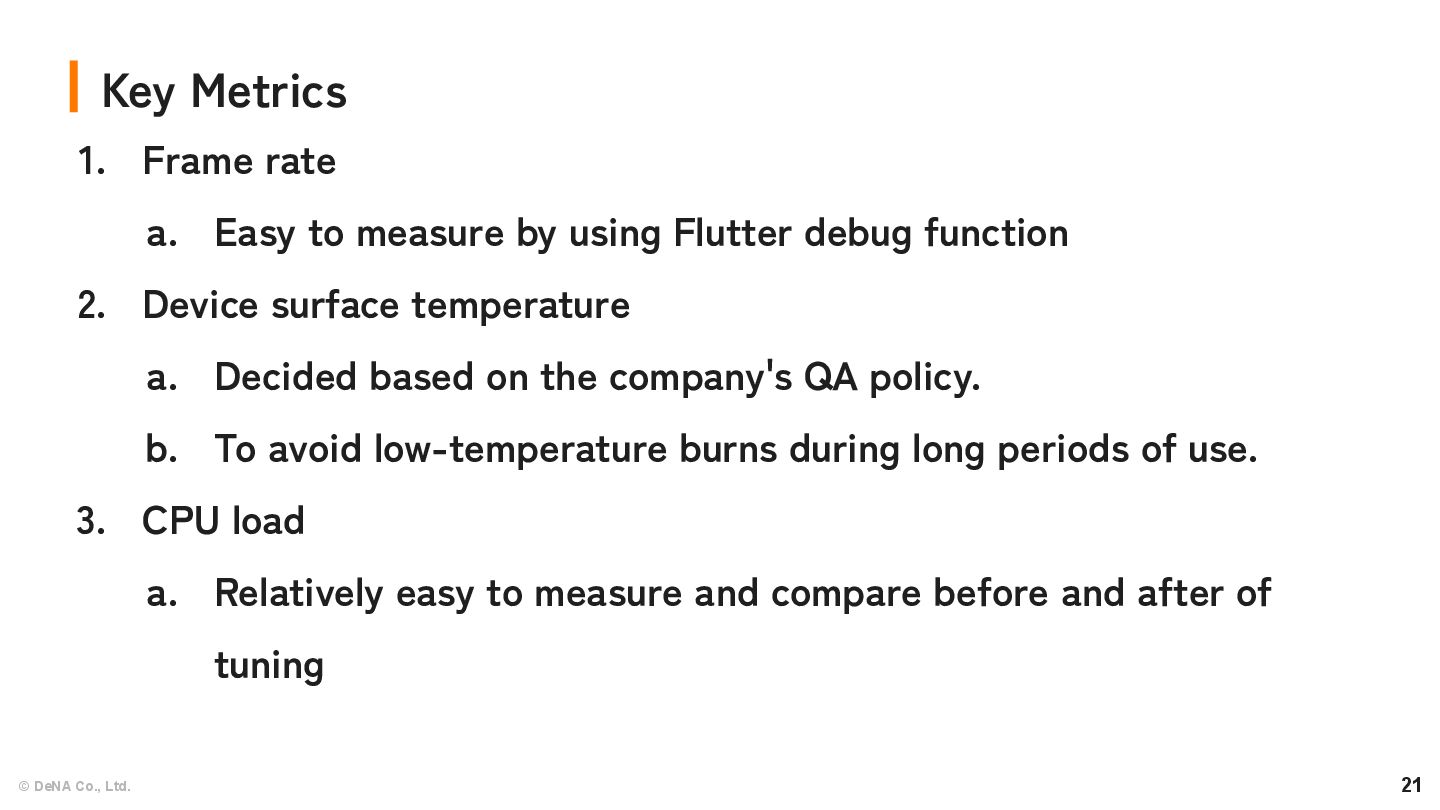 to measure by using Flutter debug function 2. Device surface temperature a. Decided based on the company's QA policy. b. To avoid low-temperature burns during long periods of use. 3. CPU load a. Relatively easy to measure and compare before and after of tuning Key Metrics