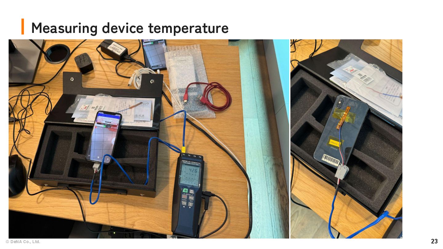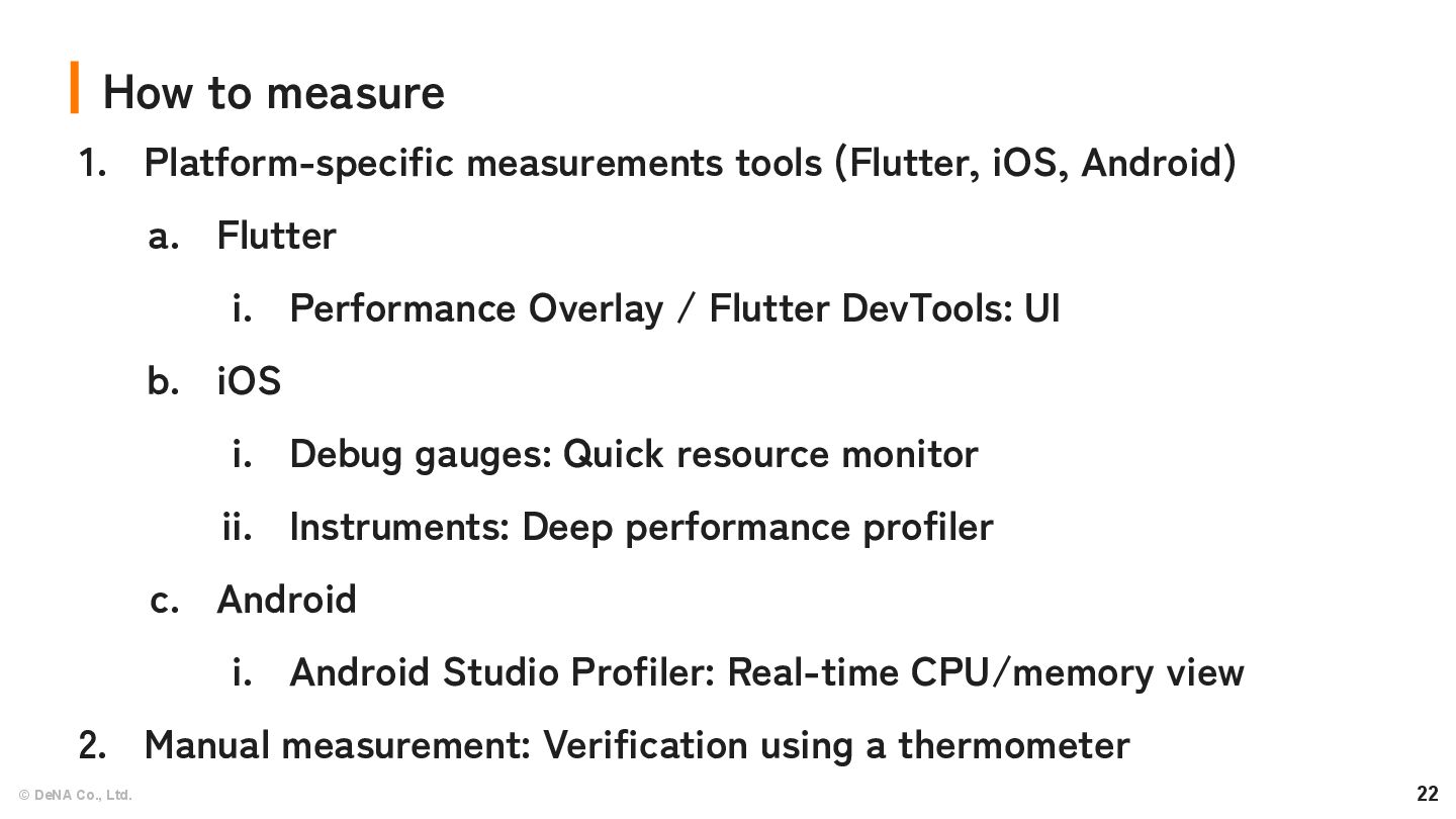 measurements tools (Flutter, iOS, Android) a. Flutter i. Performance Overlay / Flutter DevTools: UI b. iOS i. Debug gauges: Quick resource monitor ii. Instruments: Deep performance profiler c. Android i. Android Studio Profiler: Real-time CPU/memory view 2. Manual measurement: Verification using a thermometer