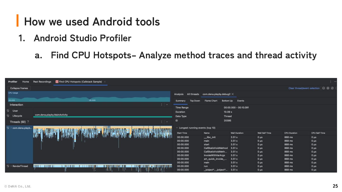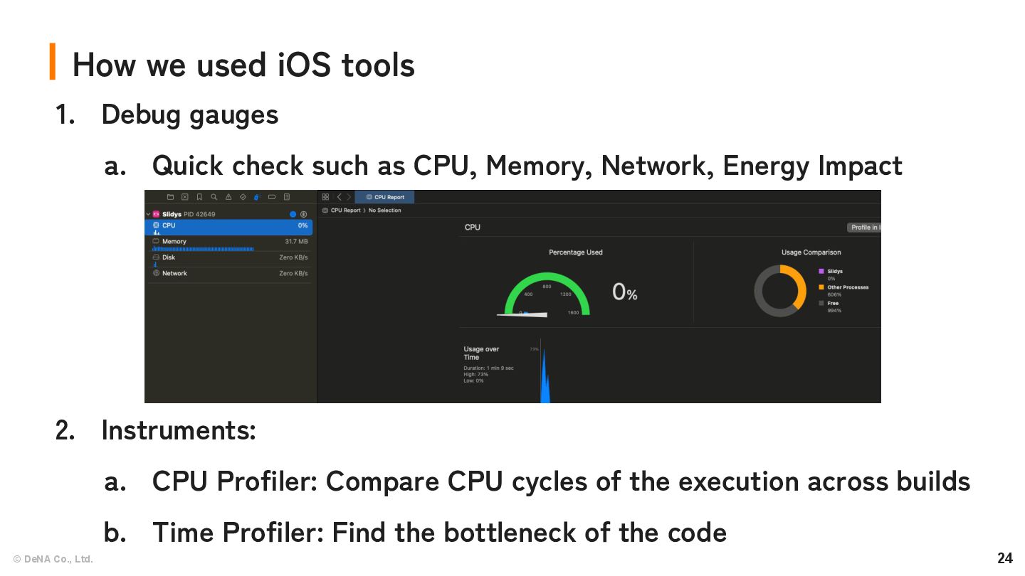 1. Debug gauges a. Quick check such as CPU, Memory, Network, Energy Impact 2. Instruments: a. CPU Profiler: Compare CPU cycles of the execution across builds b. Time Profiler: Find the bottleneck of the code