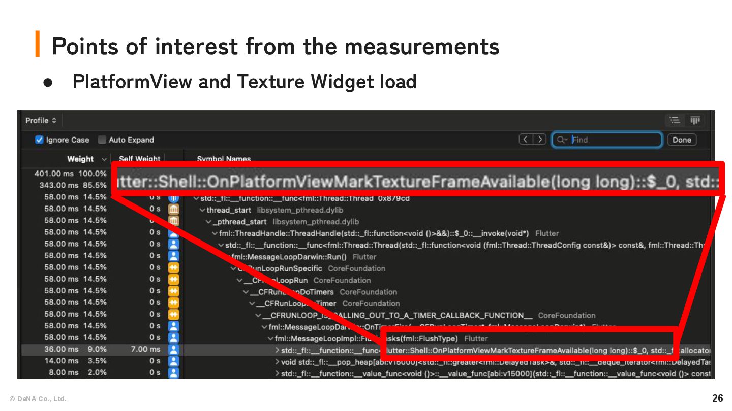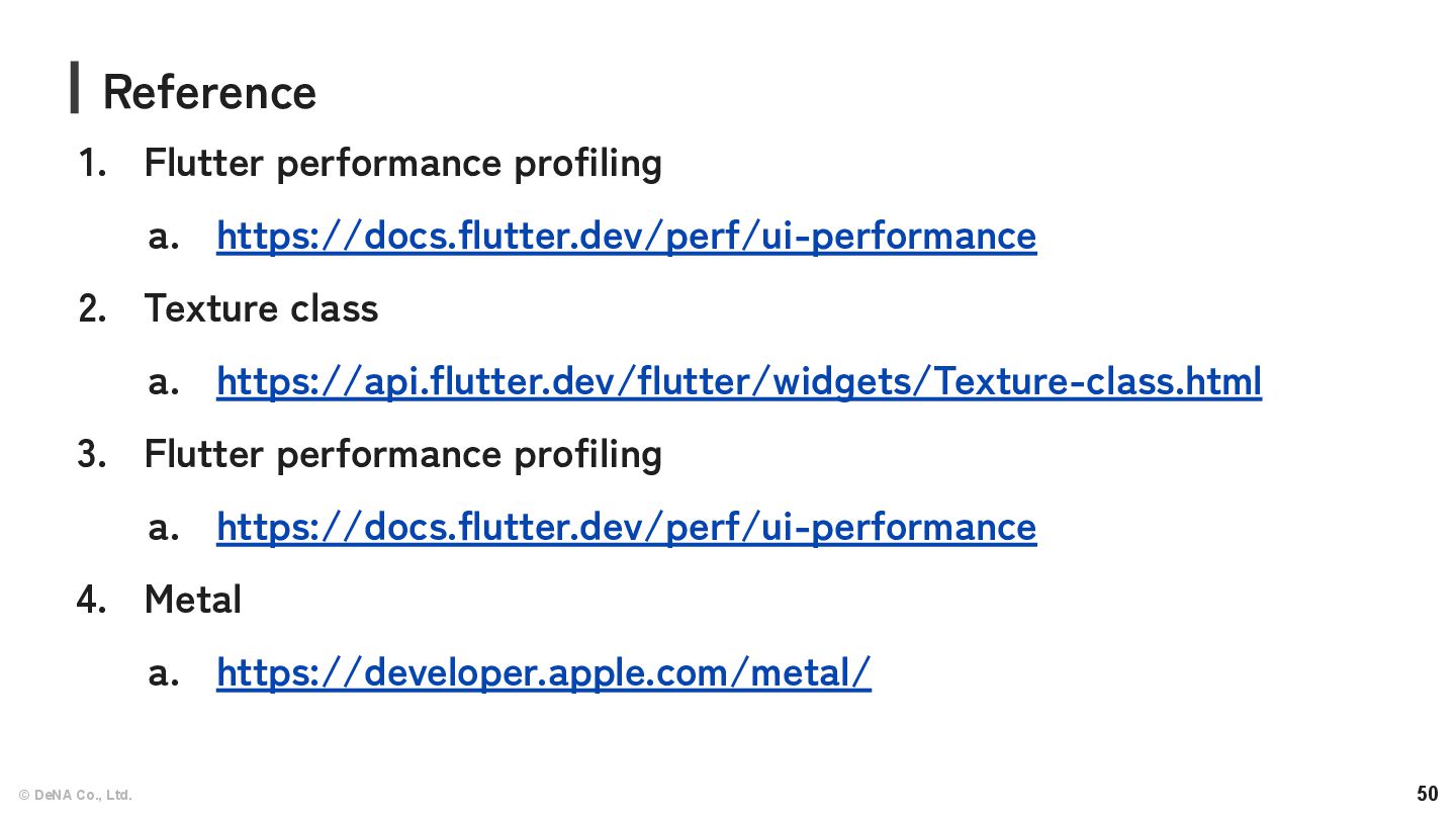 a. https://docs.flutter.dev/perf/ui-performance 2. Texture class a. https://api.flutter.dev/flutter/widgets/Texture-class.html 3. Flutter performance profiling a. https://docs.flutter.dev/perf/ui-performance 4. Metal a. https://developer.apple.com/metal/