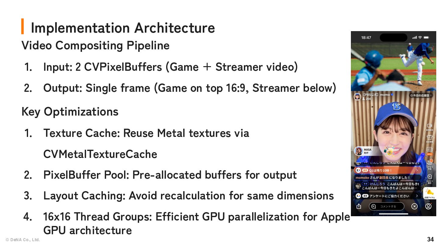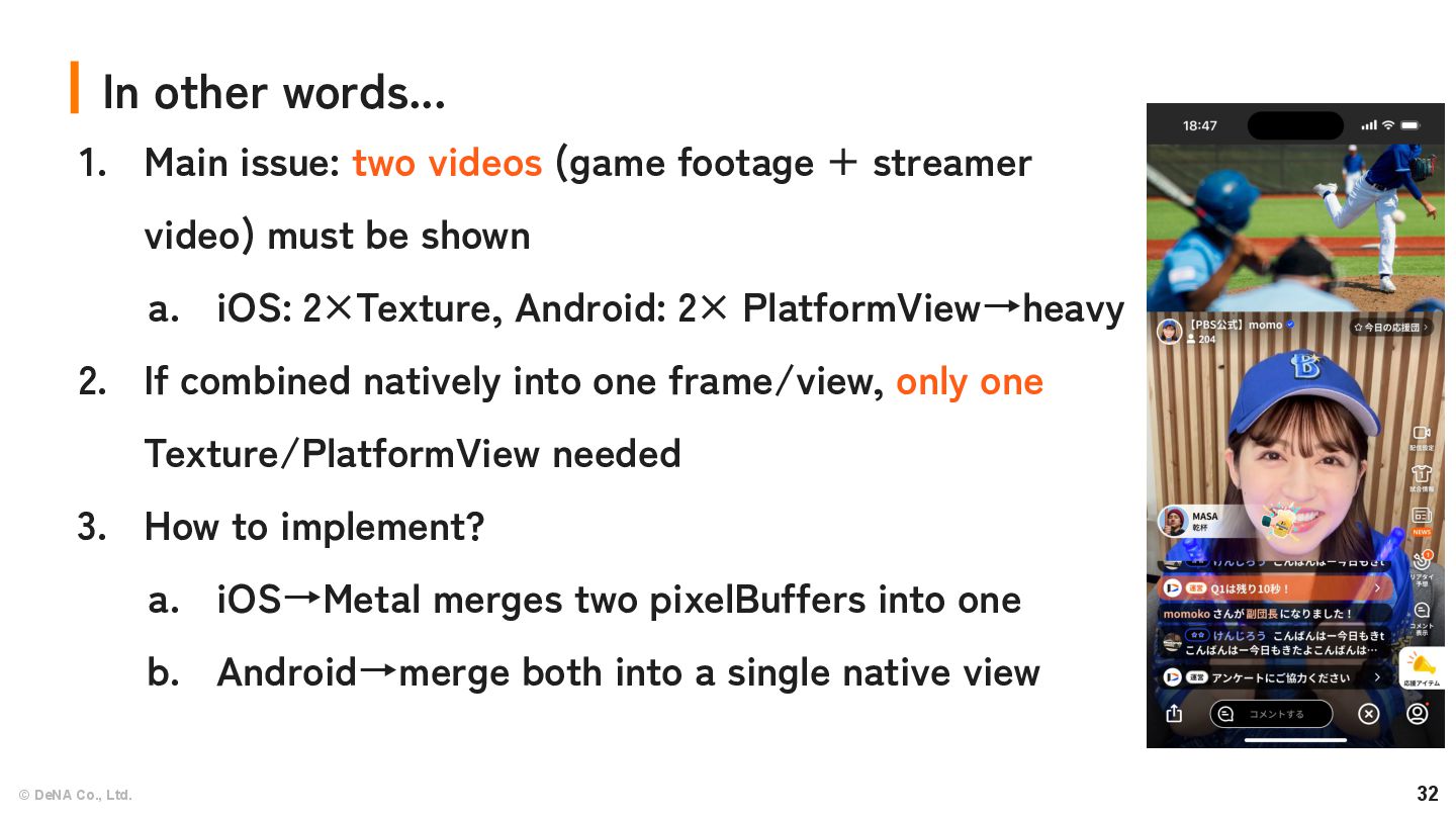 issue: two videos (game footage + streamer video) must be shown a. iOS: 2×Texture, Android: 2× PlatformView→heavy 2. If combined natively into one frame/view, only one Texture/PlatformView needed 3. How to implement? a. iOS→Metal merges two pixelBuffers into one b. Android→merge both into a single native view