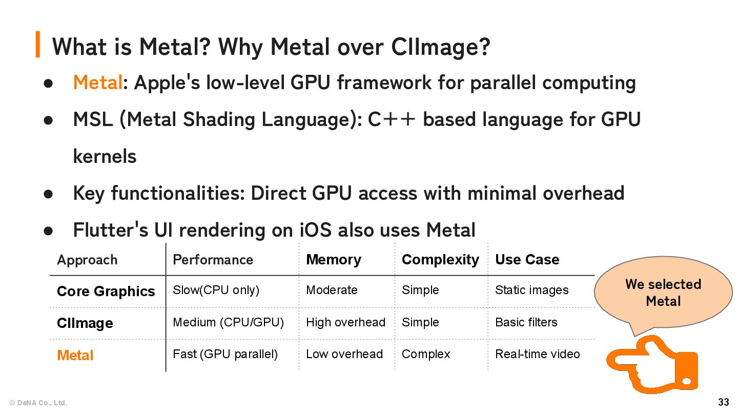 over CIImage? • Metal: Apple's low-level GPU framework for parallel computing • MSL (Metal Shading Language): C++ based language for GPU kernels • Key functionalities: Direct GPU access with minimal overhead • Flutter's UI rendering on iOS also uses Metal Approach Performance Memory Complexity Use Case Core Graphics Slow(CPU only) Moderate Simple Static images CIImage Medium (CPU/GPU) High overhead Simple Basic filters Metal Fast (GPU parallel) Low overhead Complex Real-time video We selected Metal