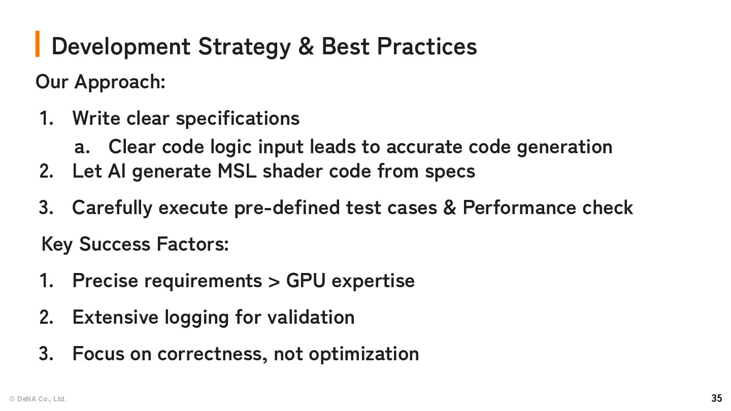 Our Approach: 1. Write clear specifications a. Clear code logic input leads to accurate code generation 2. Let AI generate MSL shader code from specs 3. Carefully execute pre-defined test cases & Performance check Key Success Factors: 1. Precise requirements > GPU expertise 2. Extensive logging for validation 3. Focus on correctness, not optimization
