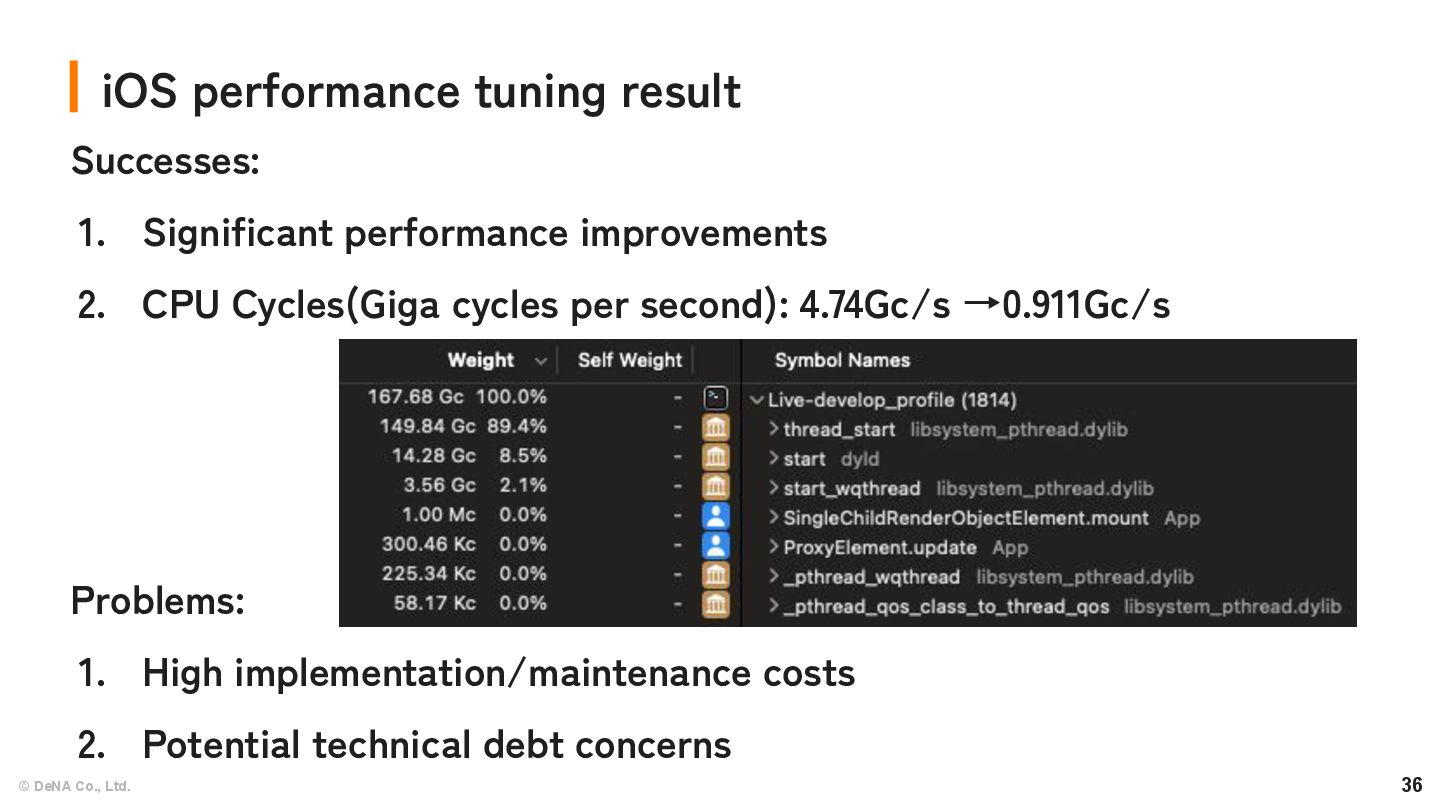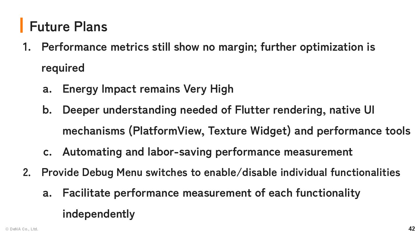 still show no margin; further optimization is required a. Energy Impact remains Very High b. Deeper understanding needed of Flutter rendering, native UI mechanisms (PlatformView, Texture Widget) and performance tools c. Automating and labor-saving performance measurement 2. Provide Debug Menu switches to enable/disable individual functionalities a. Facilitate performance measurement of each functionality independently