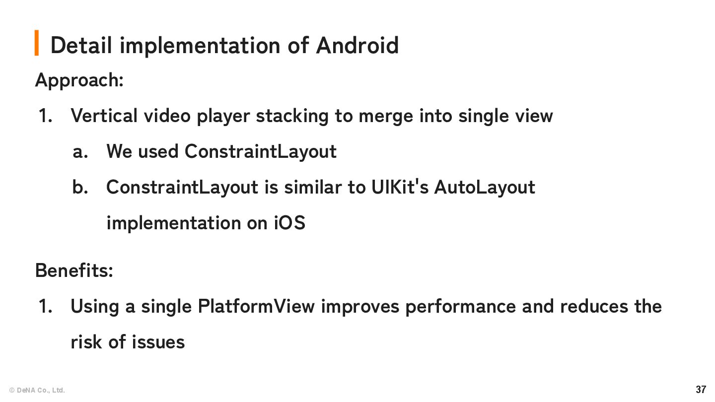 1. Vertical video player stacking to merge into single view a. We used ConstraintLayout b. ConstraintLayout is similar to UIKit's AutoLayout implementation on iOS Benefits: 1. Using a single PlatformView improves performance and reduces the risk of issues