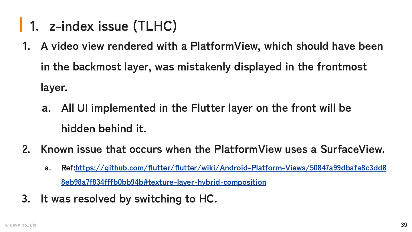 A video view rendered with a PlatformView, which should have been in the backmost layer, was mistakenly displayed in the frontmost layer. a. All UI implemented in the Flutter layer on the front will be hidden behind it. 2. Known issue that occurs when the PlatformView uses a SurfaceView. a. Ref:https://github.com/flutter/flutter/wiki/Android-Platform-Views/50847a99dbafa8c3dd8 8eb98a7f834fffb0bb94b#texture-layer-hybrid-composition 3. It was resolved by switching to HC.