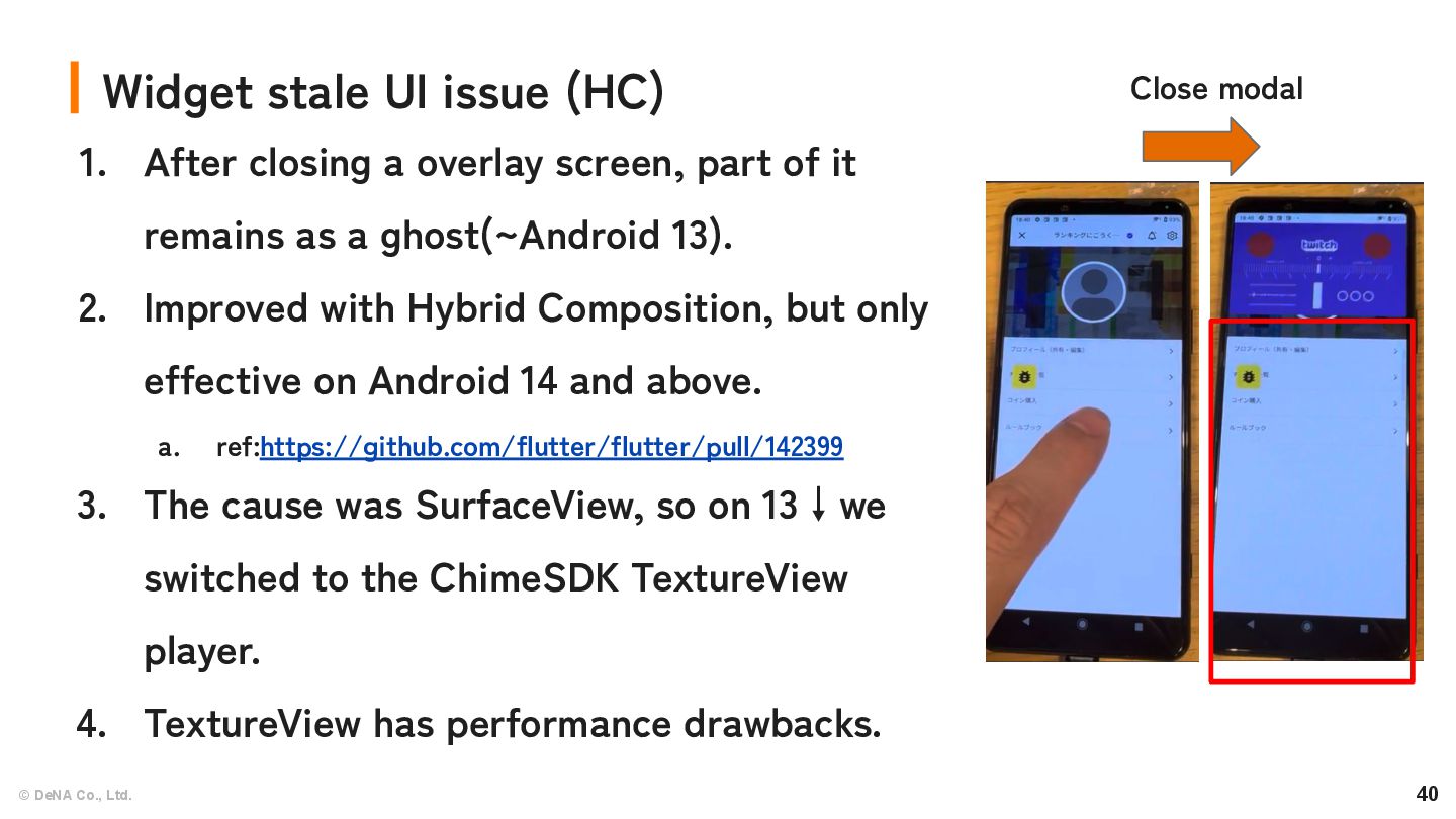 1. After closing a overlay screen, part of it remains as a ghost(~Android 13). 2. Improved with Hybrid Composition, but only effective on Android 14 and above. a. ref:https://github.com/flutter/flutter/pull/142399 3. The cause was SurfaceView, so on 13↓we switched to the ChimeSDK TextureView player. 4. TextureView has performance drawbacks. Close modal