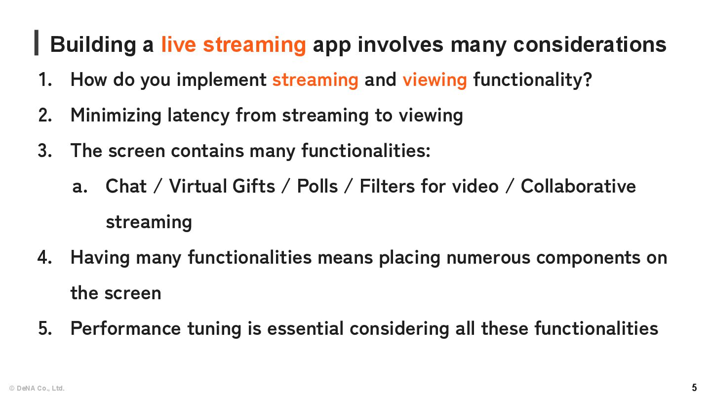 involves many considerations 1. How do you implement streaming and viewing functionality? 2. Minimizing latency from streaming to viewing 3. The screen contains many functionalities: a. Chat / Virtual Gifts / Polls / Filters for video / Collaborative streaming 4. Having many functionalities means placing numerous components on the screen 5. Performance tuning is essential considering all these functionalities