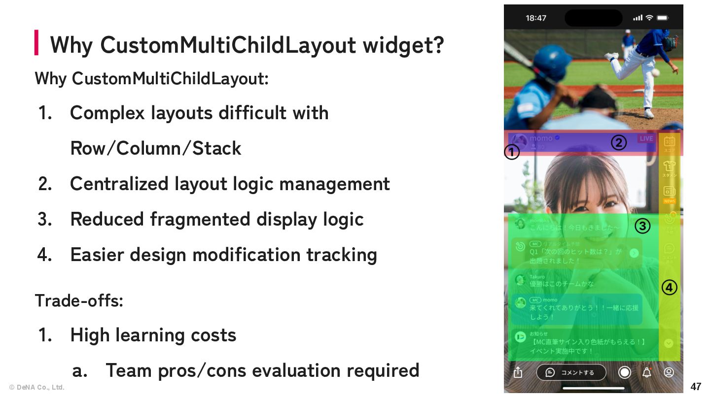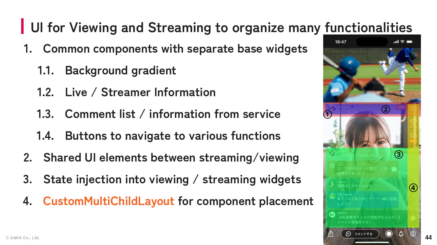 to organize many functionalities 1. Common components with separate base widgets 1.1. Background gradient 1.2. Live / Streamer Information 1.3. Comment list / information from service 1.4. Buttons to navigate to various functions 2. Shared UI elements between streaming/viewing 3. State injection into viewing / streaming widgets 4. CustomMultiChildLayout for component placement